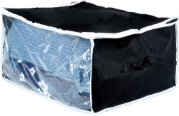 Atraskite išmanų sprendimą namų organizavimui. Šis laikymo maišas iš patvaraus juodos spalvos poliesterio audinio turi tvirtas šonines rankenas, permatomą langelį greitai turinio patikrai ir dvigubą užtrauktuką lengvam ir sandariam uždarymui. Idealu sezoniniams tekstilės gaminiams, patalynei ir stambiems drabužiams.