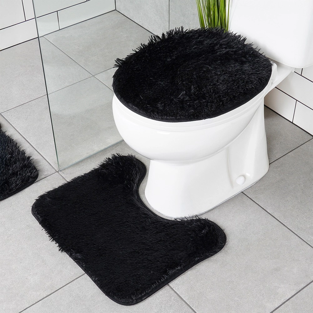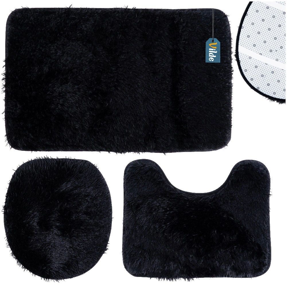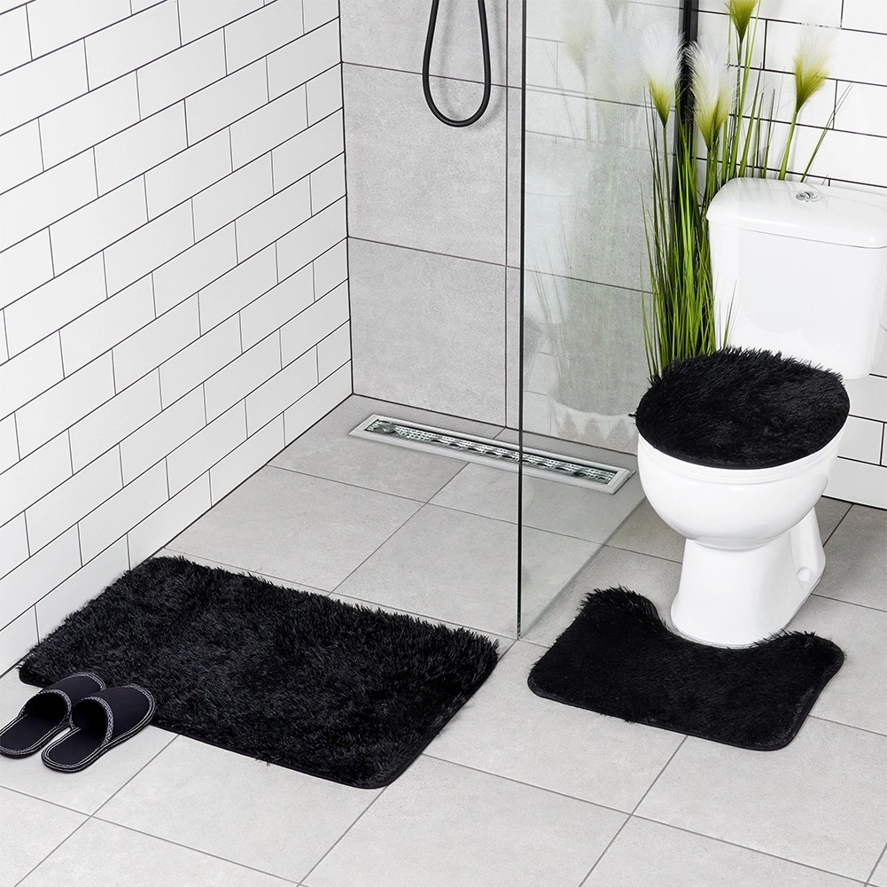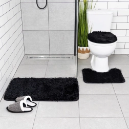 Elegantiškas trijų juodos spalvos vonios kilimėlių rinkinys kasdieniam patogumui ir saugumui. Sudėtyje yra stačiakampis kilimėlis, U formos kilimėlis prie klozeto ir tualeto dangčio užvalkalas. Minkštas, švelnus poliesterio pluoštas maloniai šildo, o neslystantis pagrindas užtikrina stabilumą ant grindų. Kilimėlius galima skalbti iki 30 °C, jie puikiai tinka tiek moderniai, tiek klasikinei voniai.