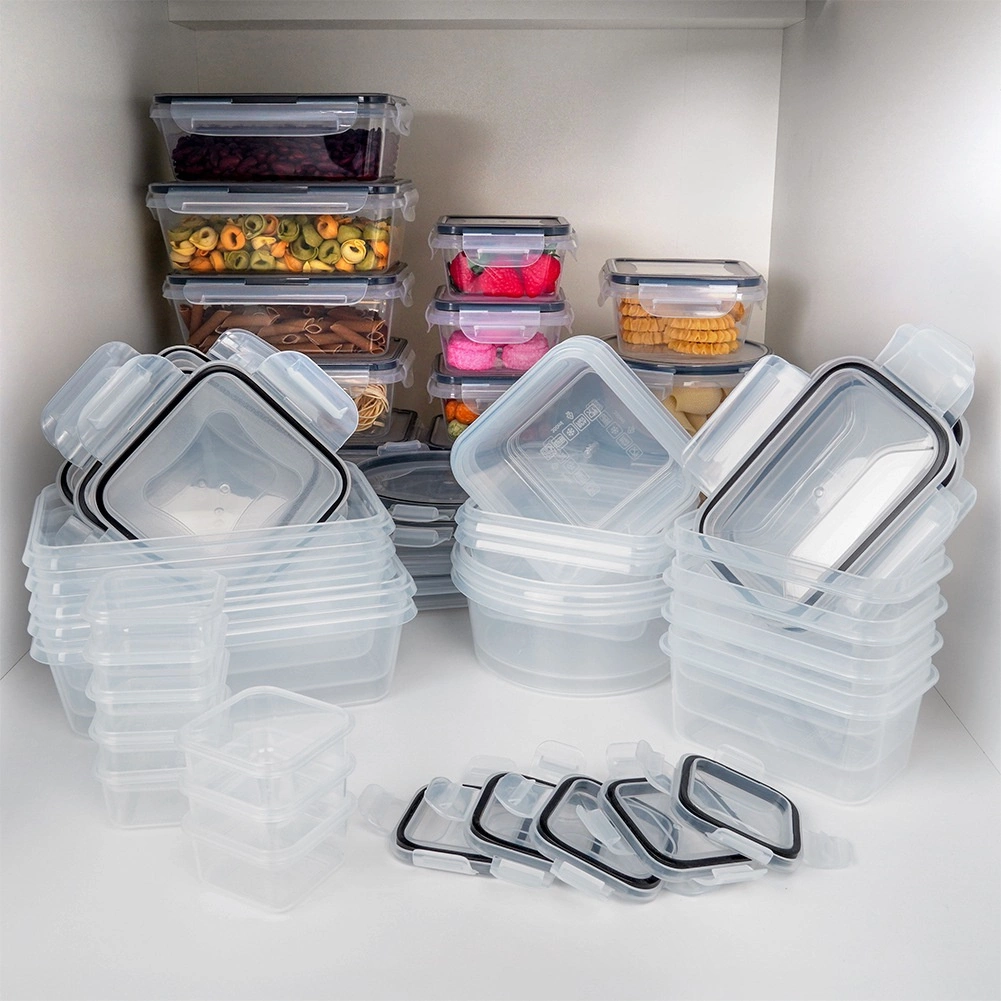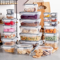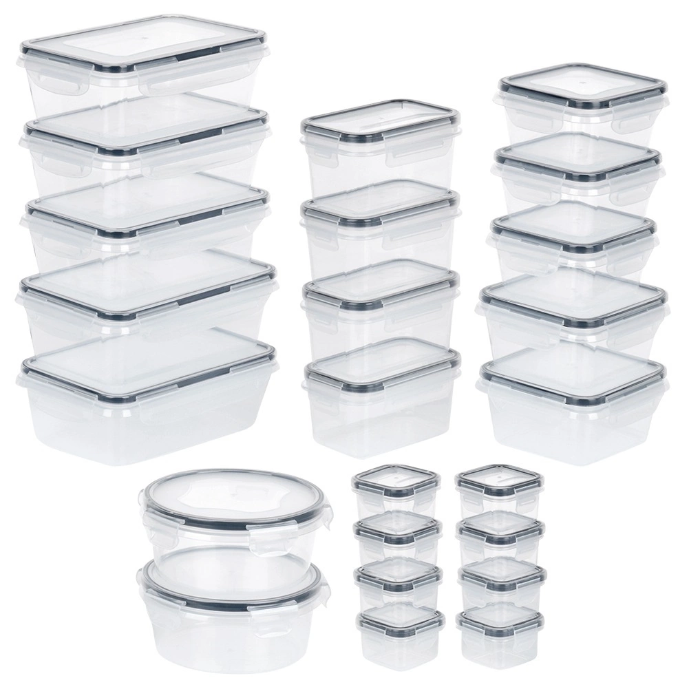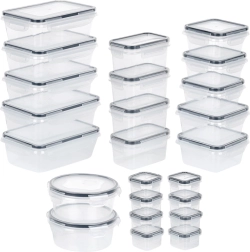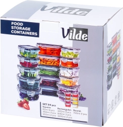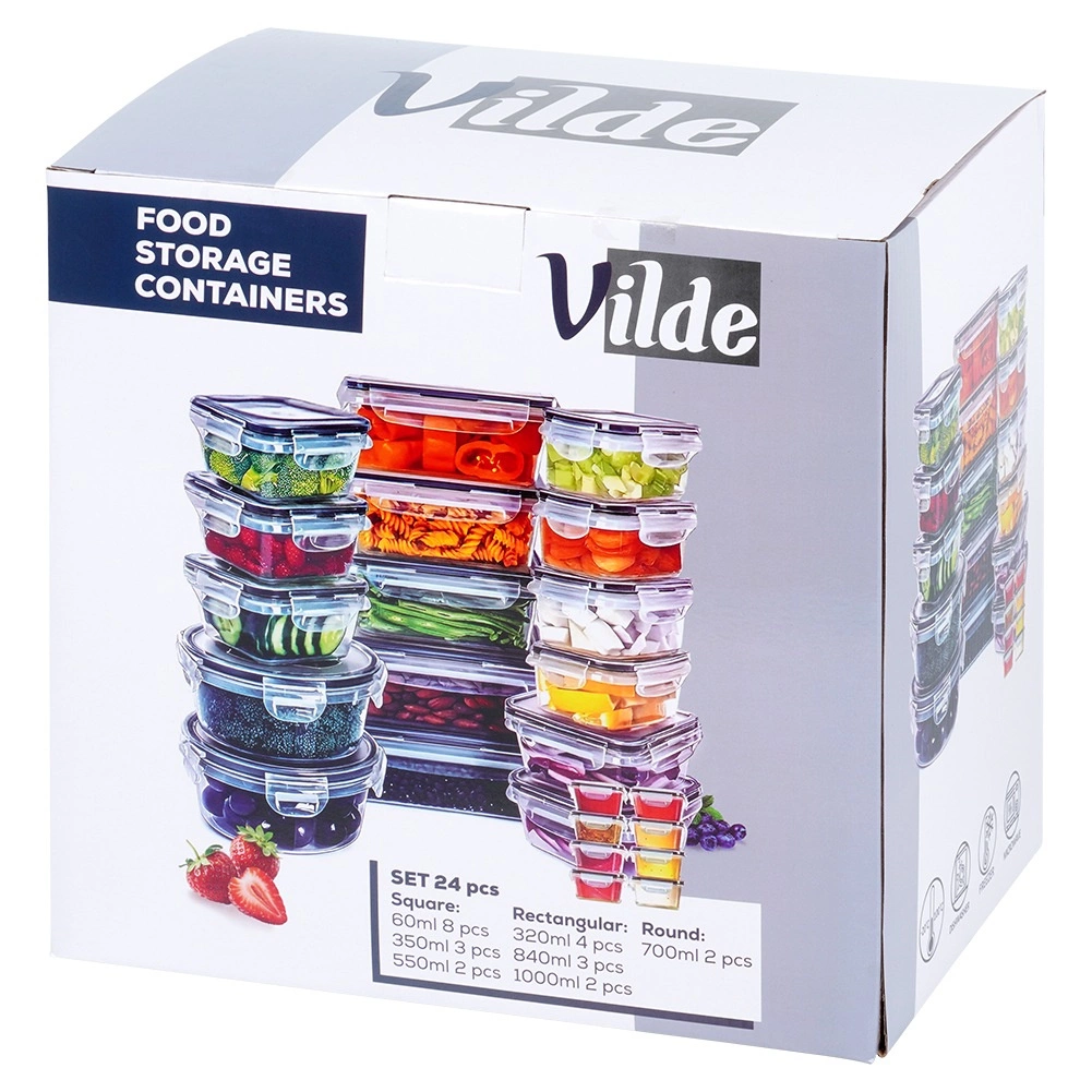Praktiškas 24 skaidrių maisto dėžučių rinkinys įvairių dydžių tvarkingam birių produktų, patiekalų ir užkandžių laikymui. Dangteliai su keturiais užraktais ir juoda tarpine užtikrina hermetišką uždarymą, ilgesnį maisto šviežumą ir saugų nešiojimąsi. Dėžutės tinka mikrobangų krosnelei (be dangtelio), šaldikliui ir indaplovei.