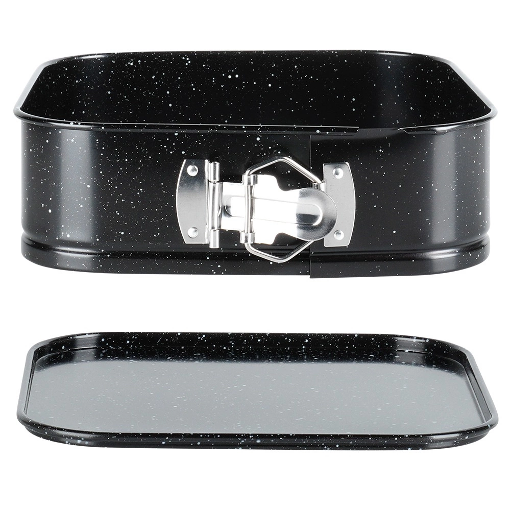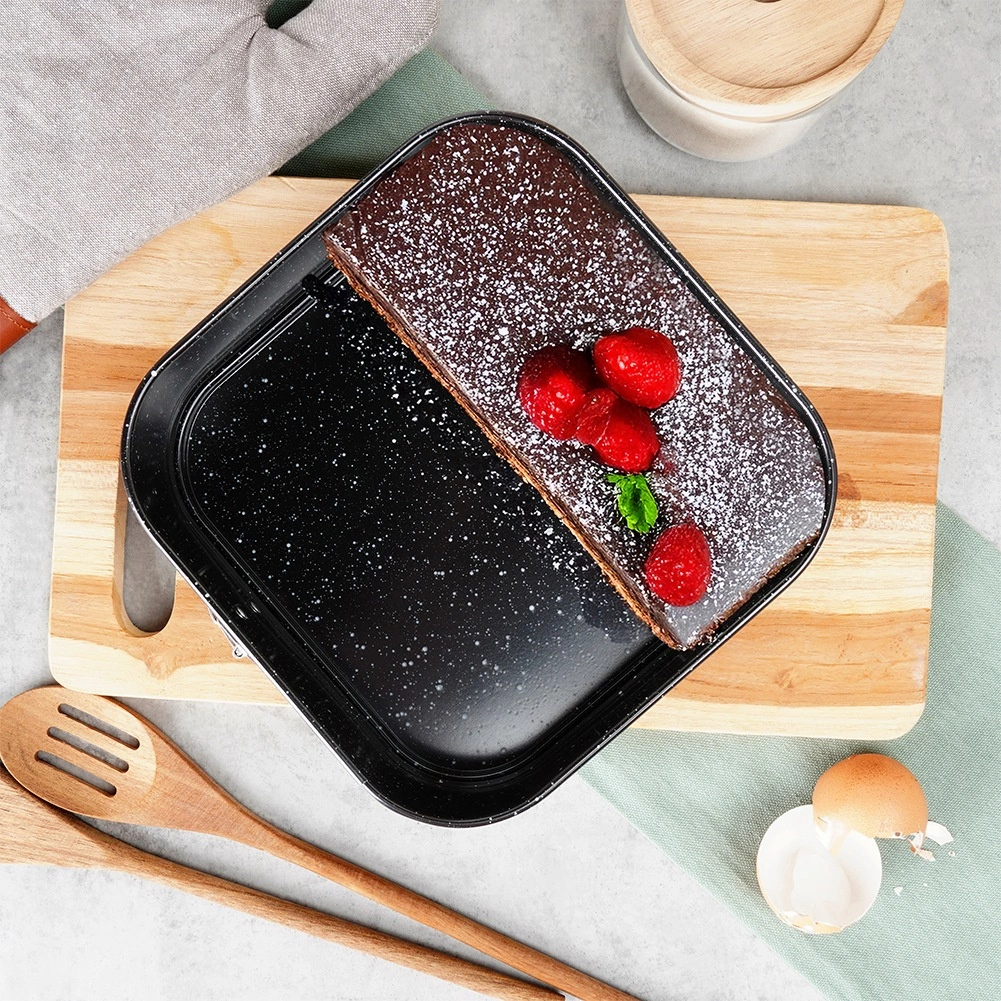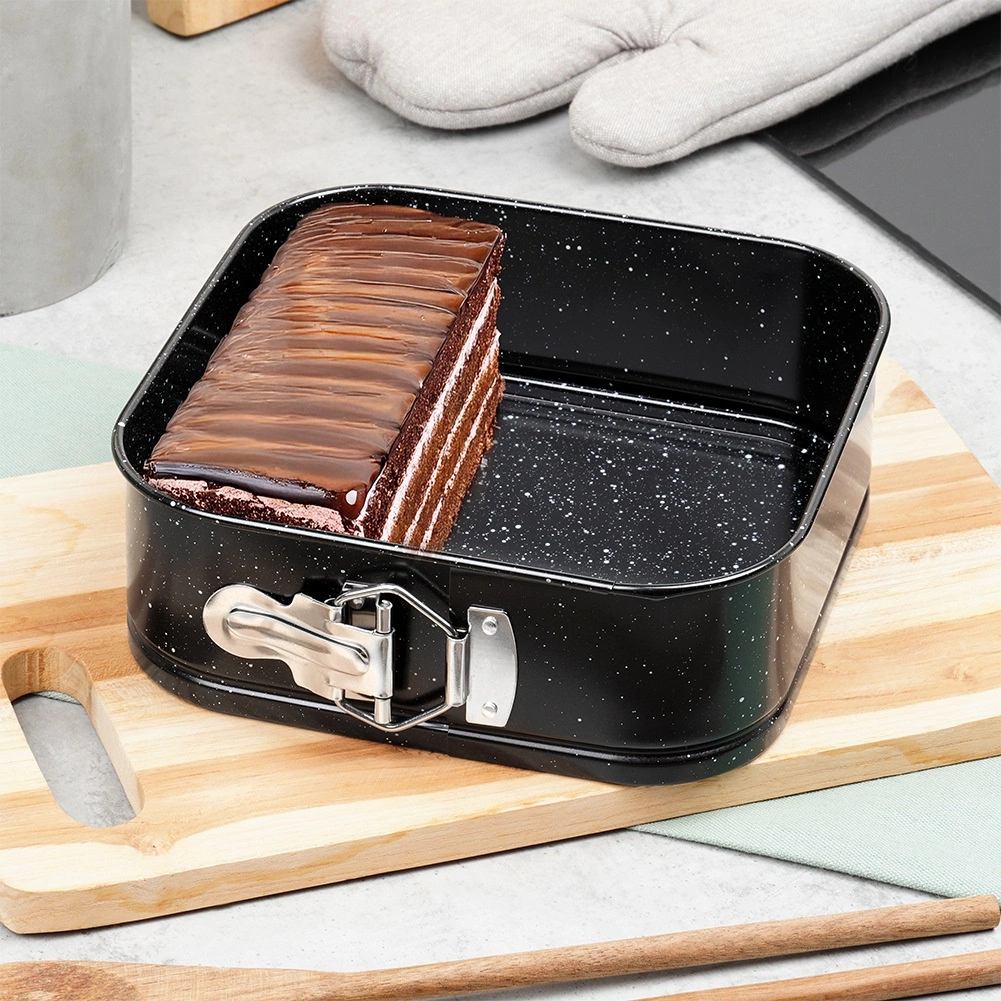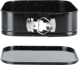 Praktiška kvadratinė kepimo forma su atsegamu kraštu ir išimamu dugnu, kad desertus būtų lengva išimti. Pagaminta iš patvaraus plieno su granito nelipnia danga, užtikrinančia tolygų kepimą, mažesnį pridegimą ir lengvą valymą. Idealiai tinka cheesecake, tortams, keksams ir apkepams.