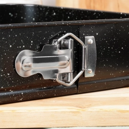 Šoninė sagtis atveria formos apvadą, todėl desertą išimsite nepažeisdami formos – idealiai tinka sūrio pyragams ir sluoksniuotiems tortams.