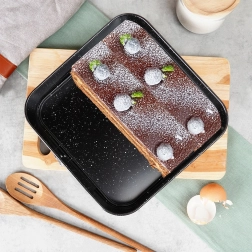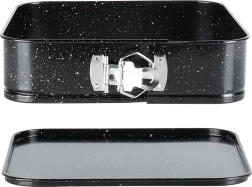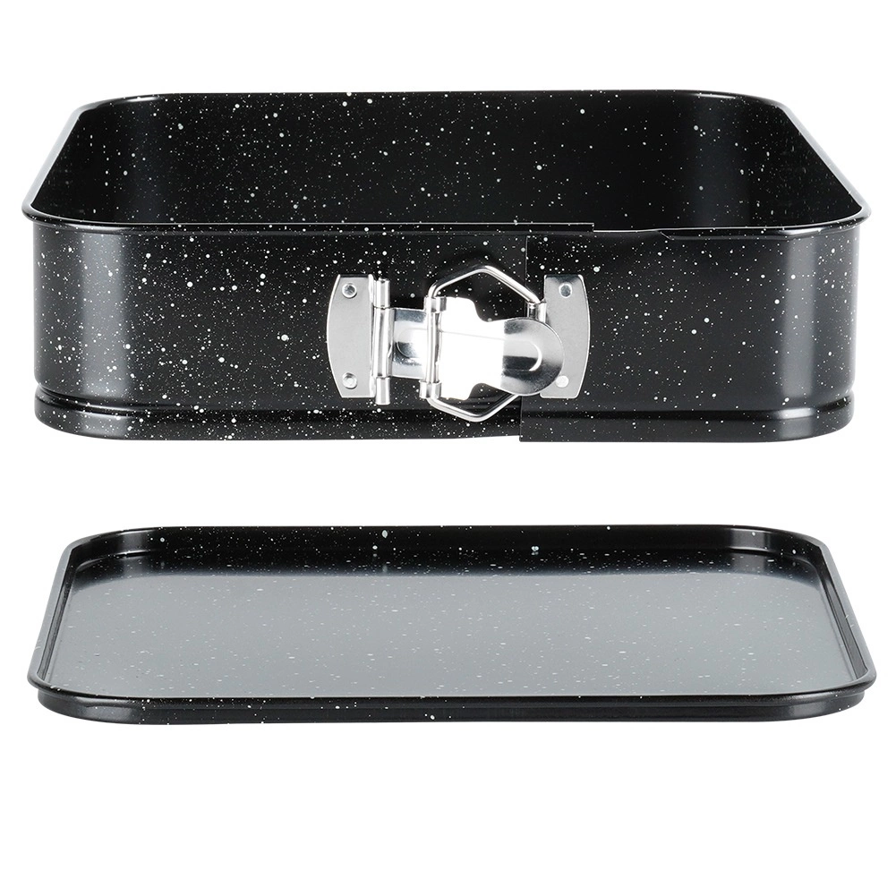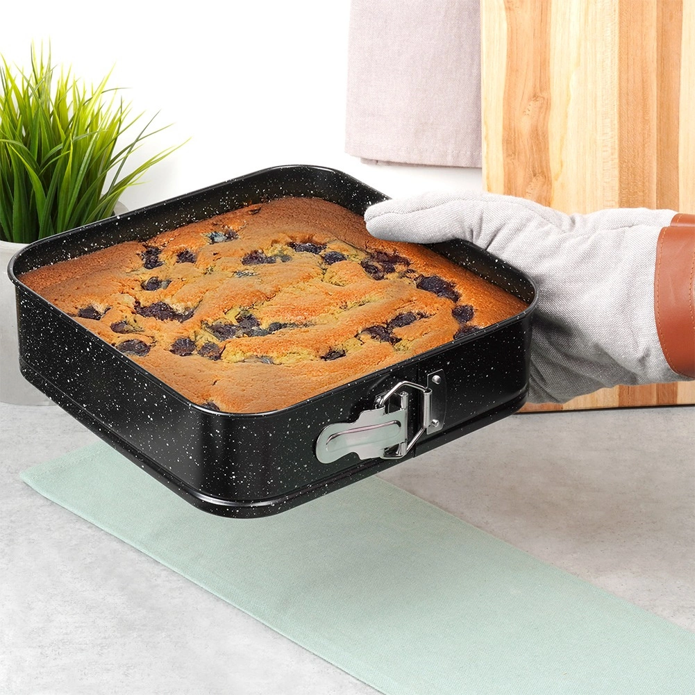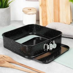 Kvadratinė išardoma forma, kurios matmenys 24 × 24 × 6,8 cm, yra patikimas pasirinkimas kasdieniam kepimui. Dėl atsegamų šonų ir išimamo dugno išimsite iškepusį tešlos gaminį nepažeisdami formos ir su minimaliomis pastangomis. Granitinė nelipni danga sumažina riebalų poreikį ir palengvina valymą.