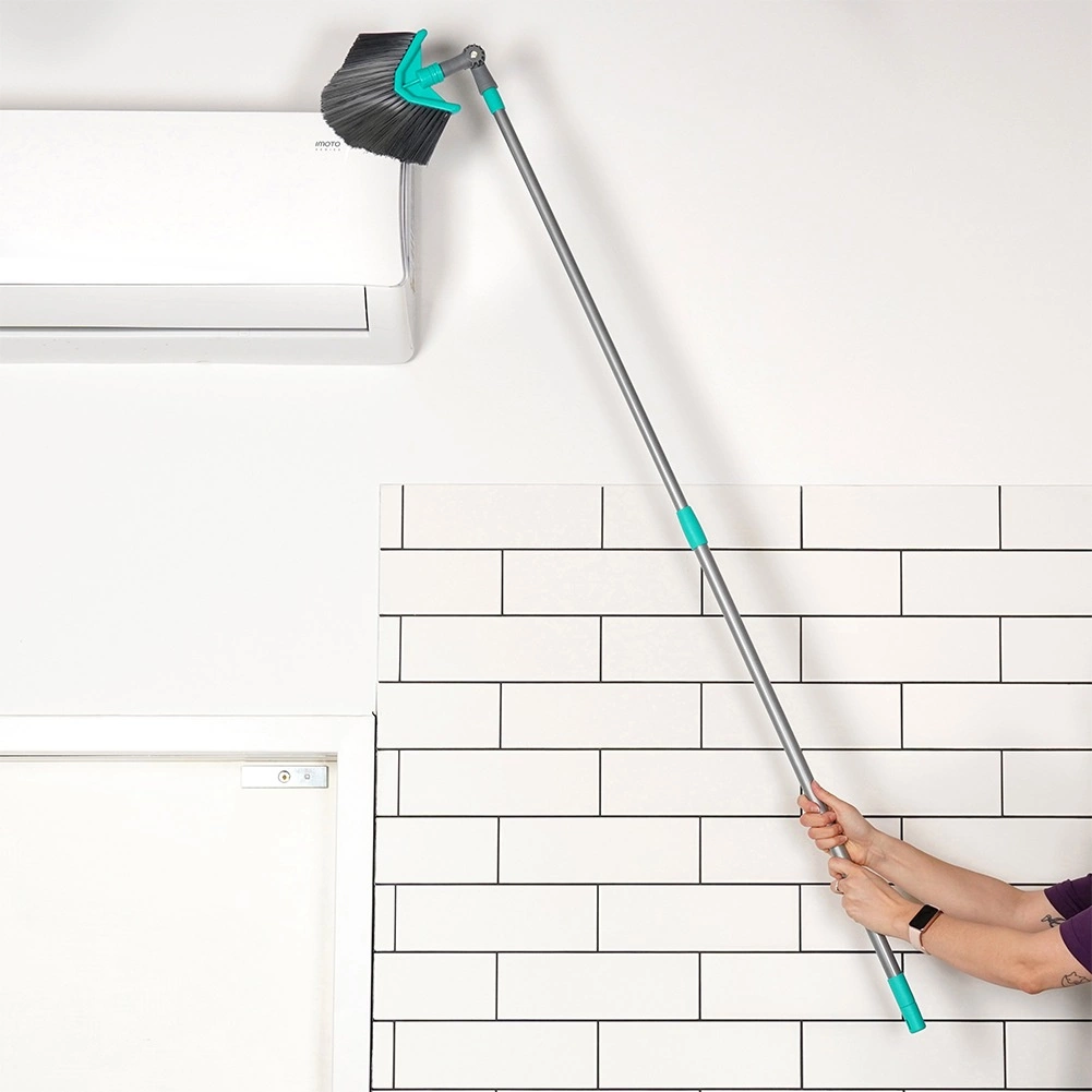 Šis universalus šepetys su teleskopiniu kotu puikiai susitvarko su valymu net sunkiai pasiekiamose vietose. Trikampė galvutė su pasukimo ir kampo reguliavimo funkcija tiksliai išvalo kampus, briaunas prie lubų ir viršutines lentynas. Dėl tolygiai reguliuojamo 115–180 cm ilgio lengvai prisitaiko prie jūsų poreikių ir sumažina kopėčių poreikį.