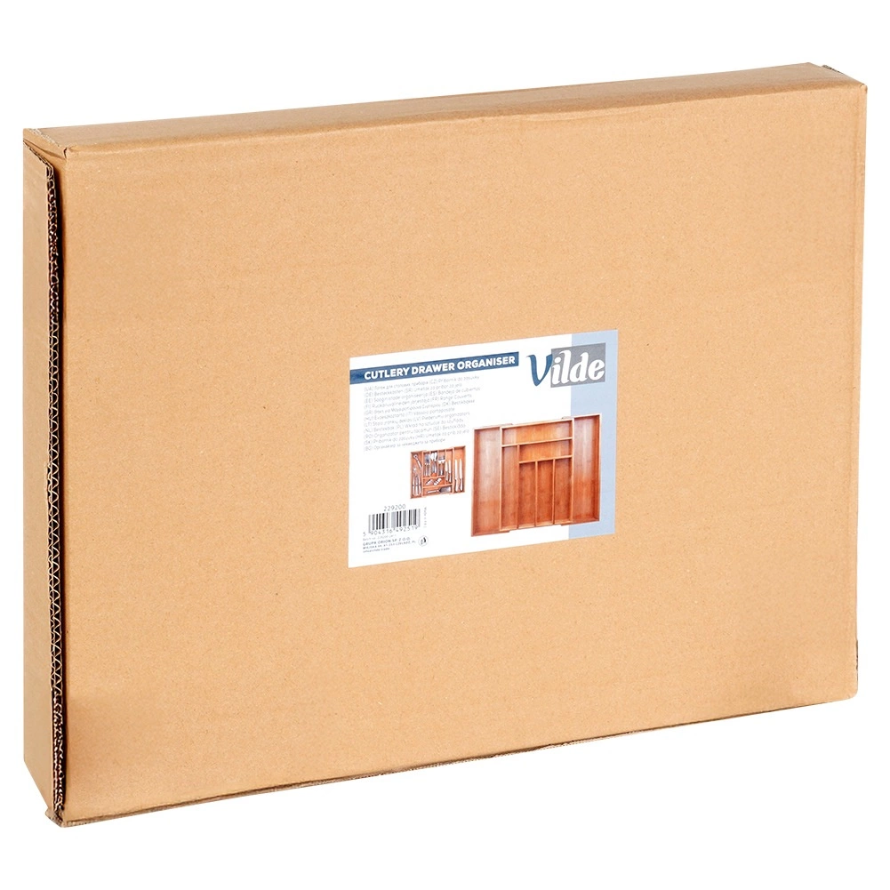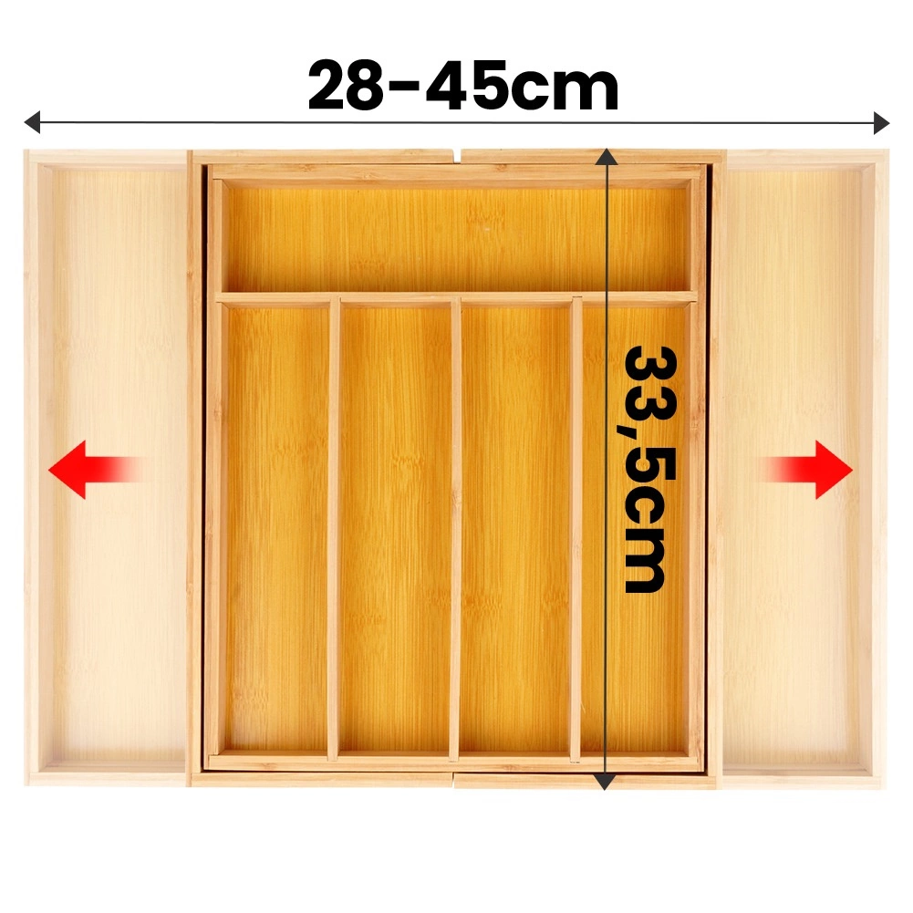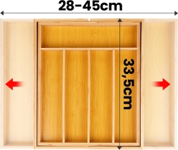 Susitvarkykite virtuvę greitai ir efektyviai. Bambukinė įdėtinė stalčiaus pertvara, išplečiama nuo 35,5 iki 54,5 cm, prisitaiko prie daugumos standartinių stalčių ir suteikia pakankamai vietos stalo įrankiams, peiliams ir virtuvės reikmenims. Uždaros būsenos matmenys: 45,5 × 35,5 × 5 cm, išskleistos – 54,5 × 45,5 × 5 cm.