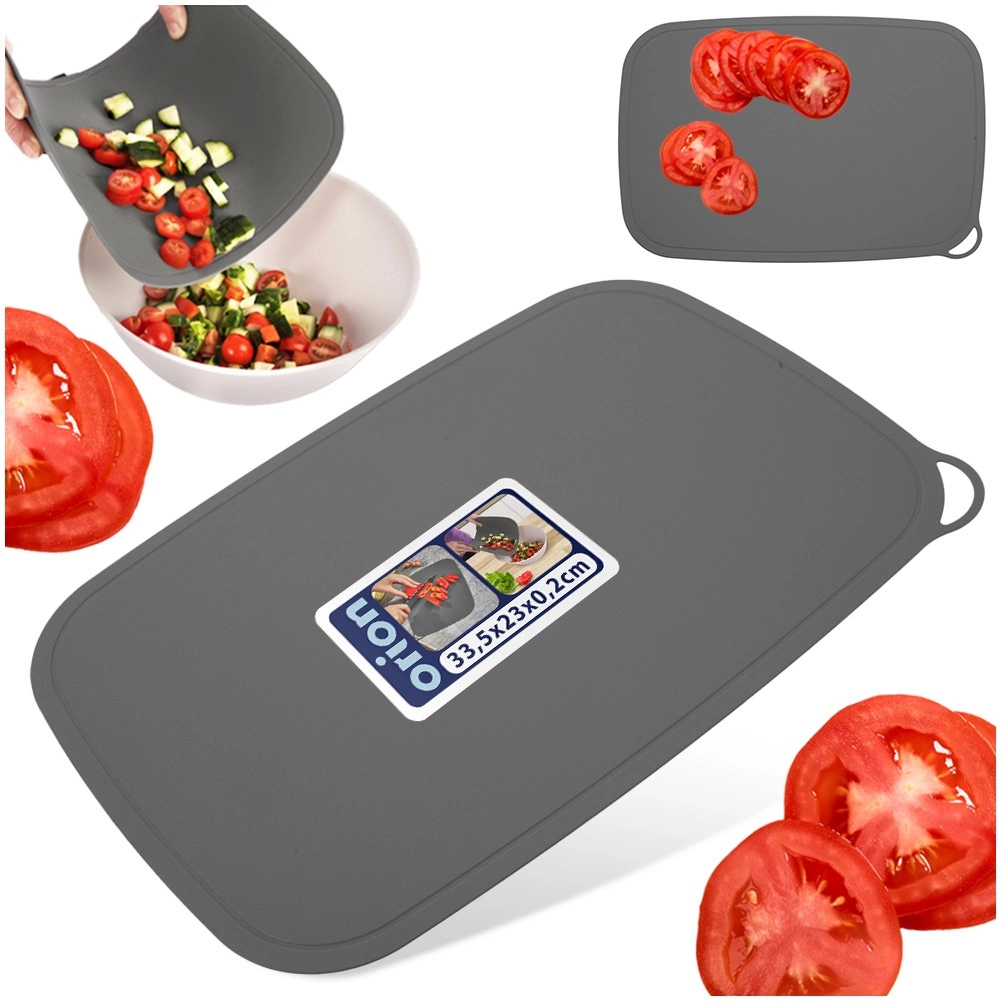 Praktiška elastinė pjaustymo lenta iš kokybiško plastiko, pilkos spalvos, matmenys 33,5 × 23 × 0,1 cm. Dėl lankstaus dizaino lengvai nubersite supjaustytus produktus tiesiai į dubenį ar puodą, lenta yra tyli, lengva ir tausojanti peilių ašmenis. Galima plauti indaplovėje, atspari iki +95 °C. ORION kokybė kiekvienai virtuvei.