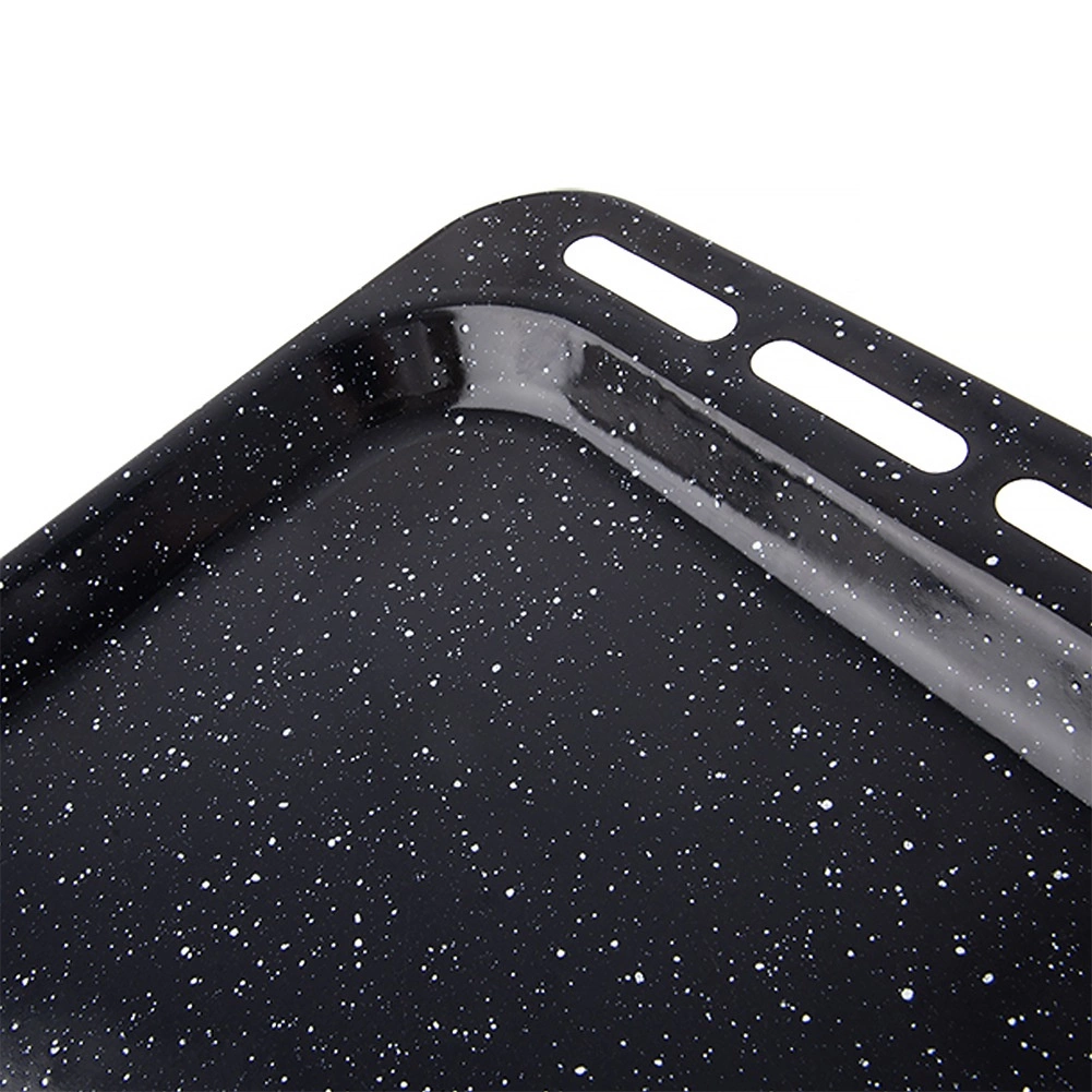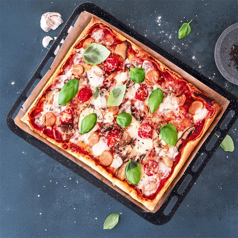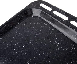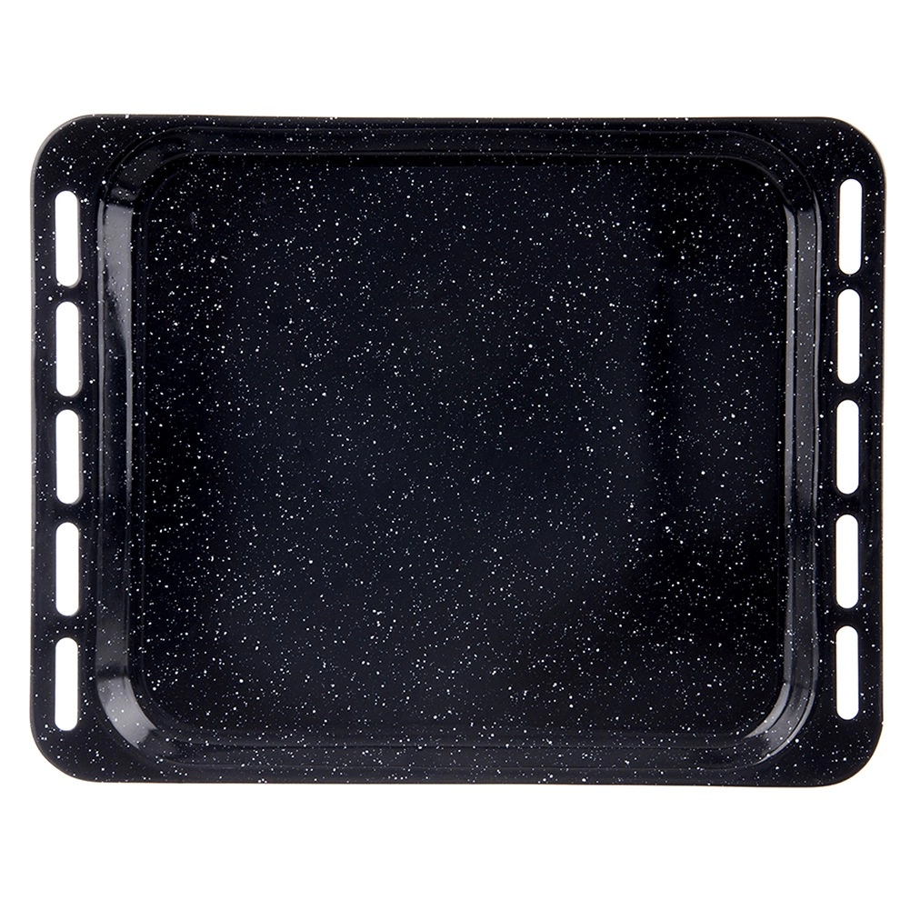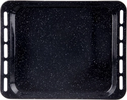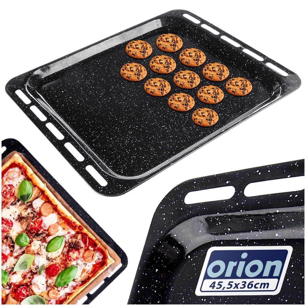 Tvirtas plienas su emalio danga atsparus aukštai temperatūrai, ilgaamžis ir tinkamas dujinėms ir elektrinėms orkaitėms. Skarda siūlo praktiškus matmenis: išoriniai 45,5 × 36 × 2,5 cm ir vidinis plotas apie 38 × 34,5 × 2,5 cm, kas suteikia pakankamai vietos tolygiam kepimui. Po naudojimo tiesiog įdėkite į indaplovę.