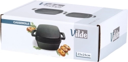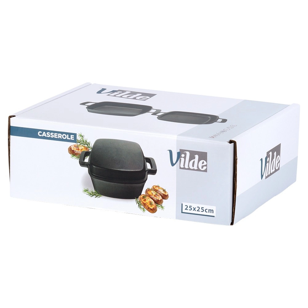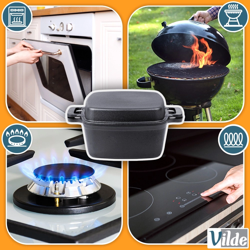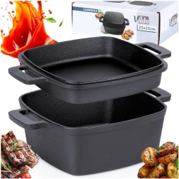Universalus kvadratinis 2in1 ketaus puodas su dangčiu, kuris taip pat veikia kaip atskira keptuvė/kepsninė forma. Masyvus ketus puikiai veda ir kaupia šilumą, yra atsparus aukštai temperatūrai ir tinka visų tipų viryklėms, įskaitant indukcines, orkaitei, griliui ir net atvirai ugniai. Idealu troškinti, kepti, virti sriubas, guliašus ir užkeptus patiekalus. Originalus VILDE produktas iš CAST LINE linijos.