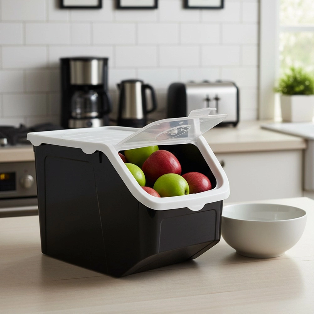 Palaikykite tvarką sandėliuke ir ant stalviršio su erdviu 12 l konteineriu. Dėl skaidraus atverčiamo vožtuvo greitai patikrinsite turinį ir lengvai paimsite reikiamą kiekį. Sandarus baltas dangtis saugo nuo drėgmės ir kvapų, o reguliuojama ventiliacija padeda išlaikyti vaisius ir daržoves ilgiau šviežius.