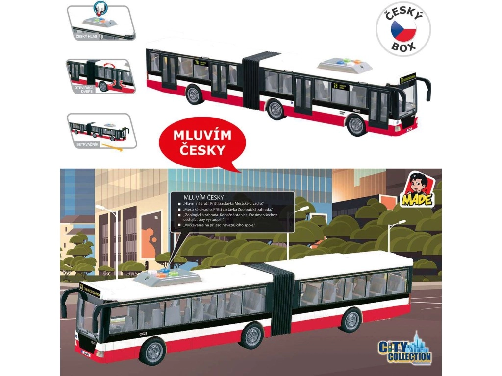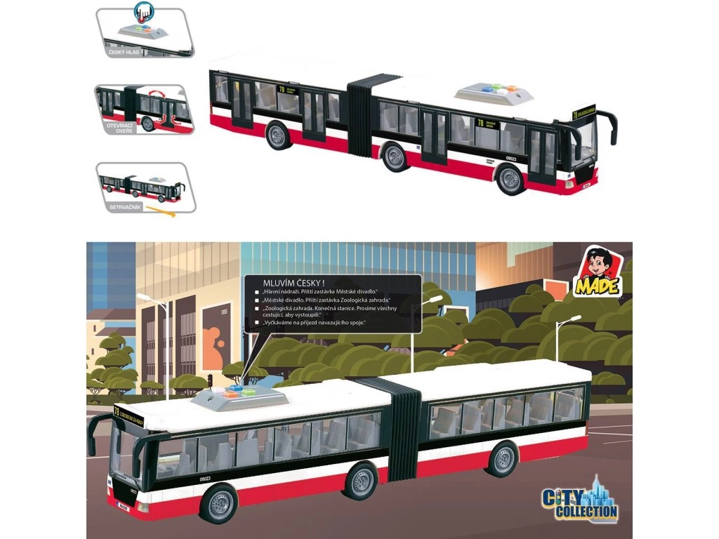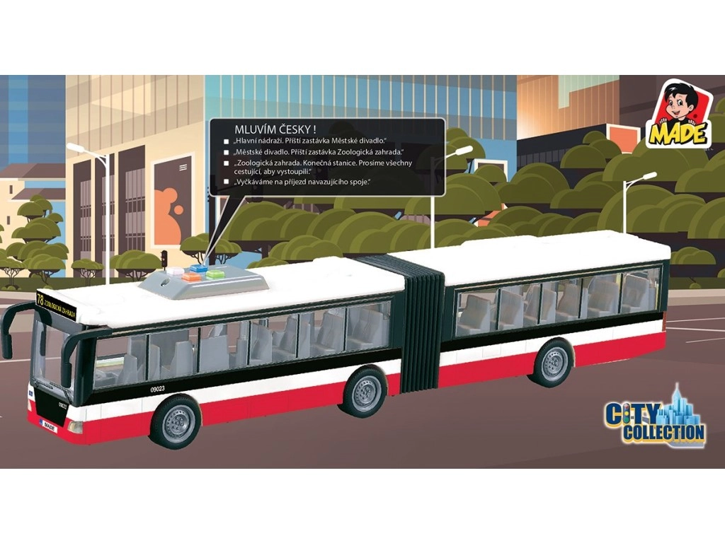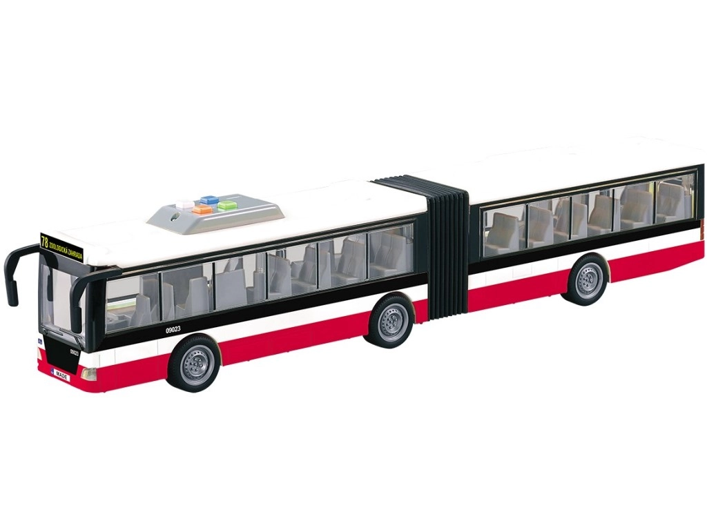 Sąstatinis miesto autobusas su inercine pavara, turintis šviesos efektus ir čekų kalbos stotelių pranešimus, pradžiugins visus mažuosius vairuotojus. Jis siūlo lankstų jungtį, realistišką CZ dizainą ir yra paruoštas važiavimui iškart po išpakavimo, nes komplekte yra baterijos.