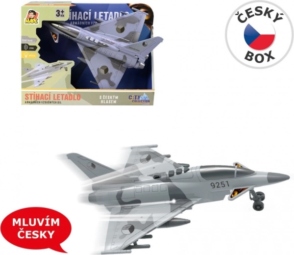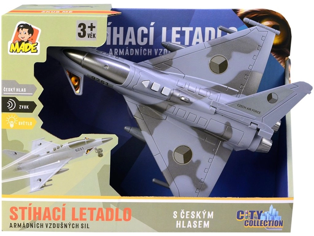 Mėgaukitės įtemptomis oro misijomis su detaliai sukurtu naikintuvu, papuoštu Čekijos Respublikos atpažinimo ženklais. Modelis siūlo autentiškus dialogus čekų kalba tarp valdymo bokšto ir piloto, šviesos efektus ir skriejančio naikintuvo garsą, kurie sustiprina žaidimo atmosferą.