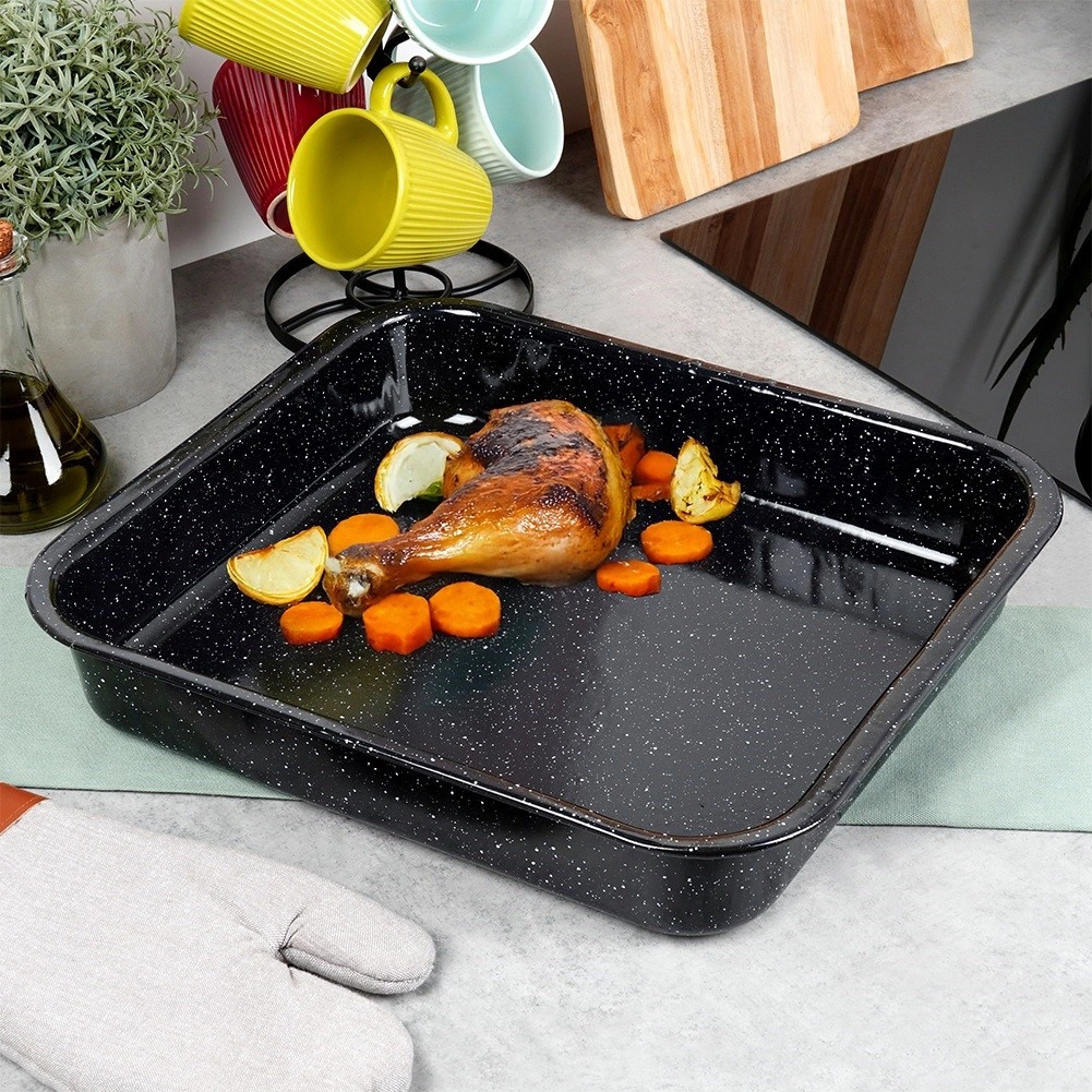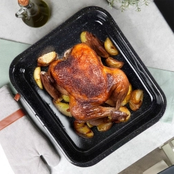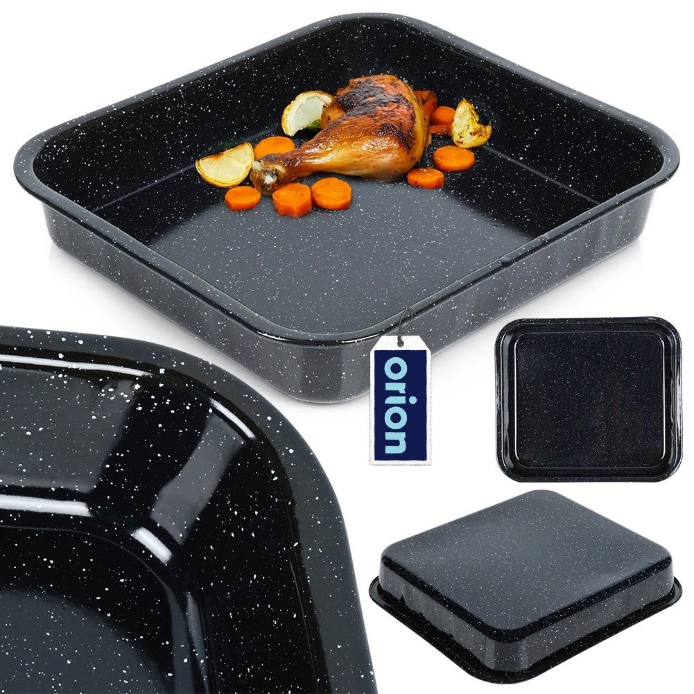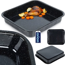 Erdvus 8 litrų talpos emaliuotas kepimo indas, kurio matmenys 41,5 × 36,5 × 7 cm, puikiai tinka mėsos, daržovių ir desertų kepimui bei apkepams. Aukštos kokybės emaliuotas paviršius yra saugus sveikatai, nepridegantis ir lengvai valomas. Tinka naudoti dujinėse ir elektrinėse orkaitėse, galima plauti indaplovėje.