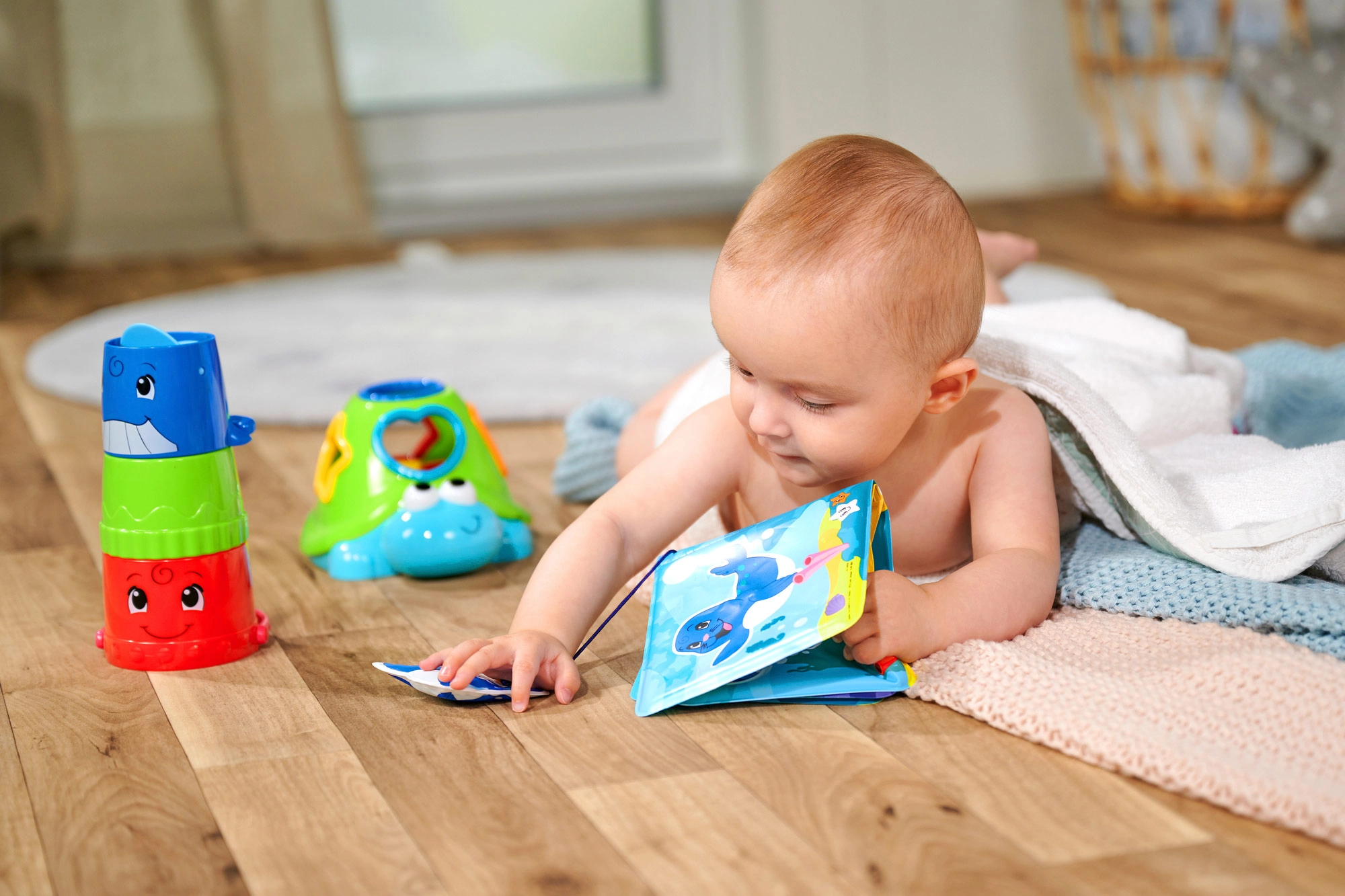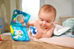 Komplekte yra smagus cypsintis pakabukas, kuris motyvuoja spausti, stiprina smulkiąją motoriką ir suteikia džiaugsmo atrandant garsus. Knygelė plūduriuoja vandens paviršiuje, todėl vaikai gali ją vartinėti tiesiog maudydamiesi.