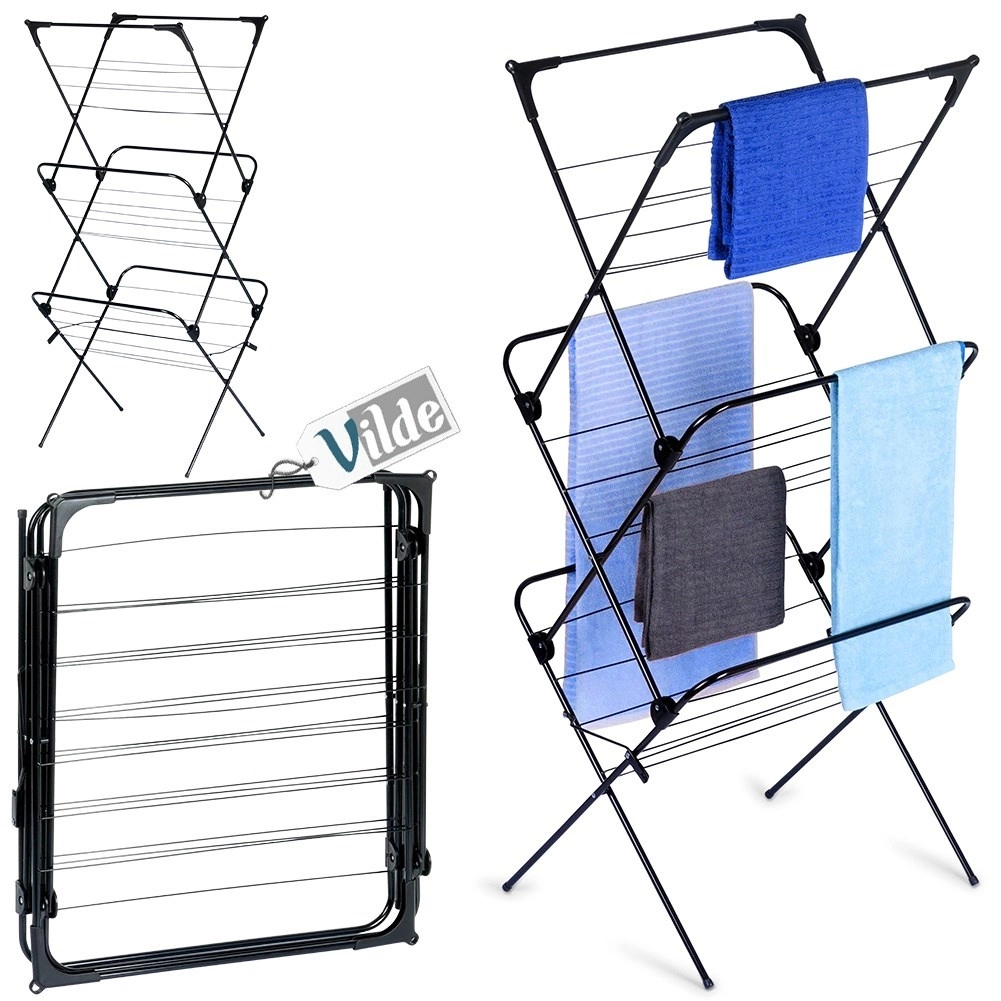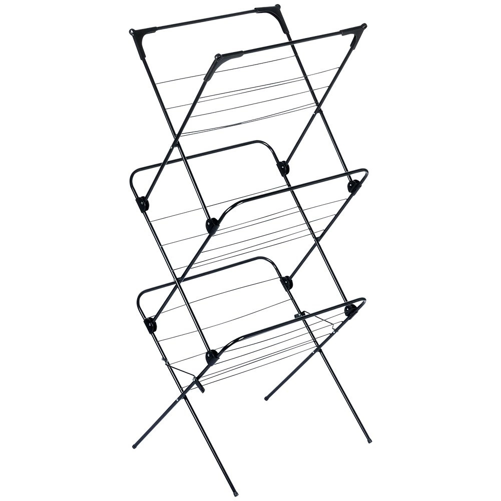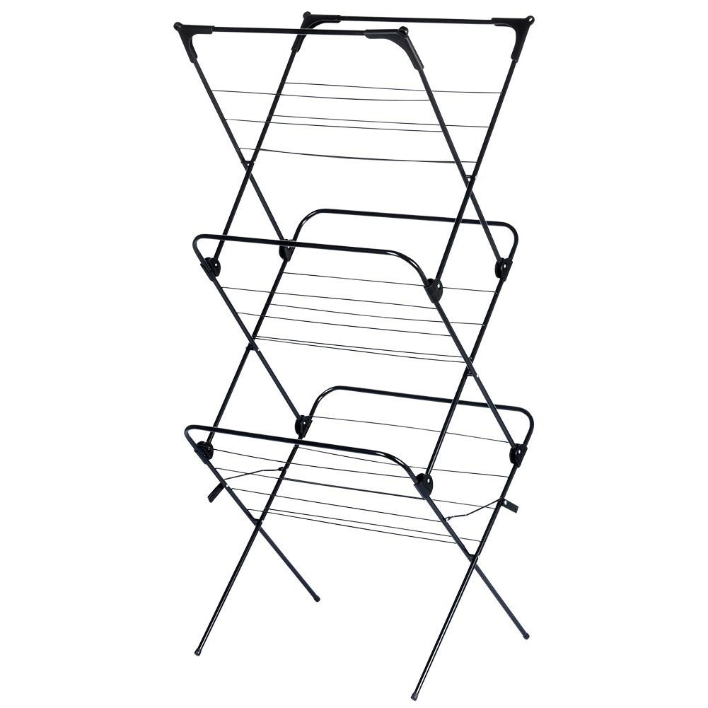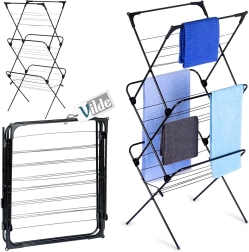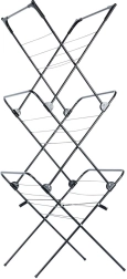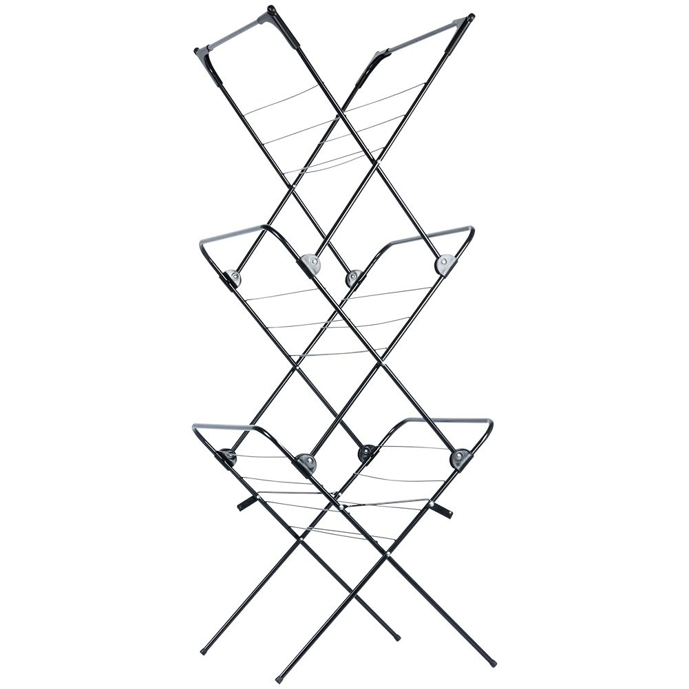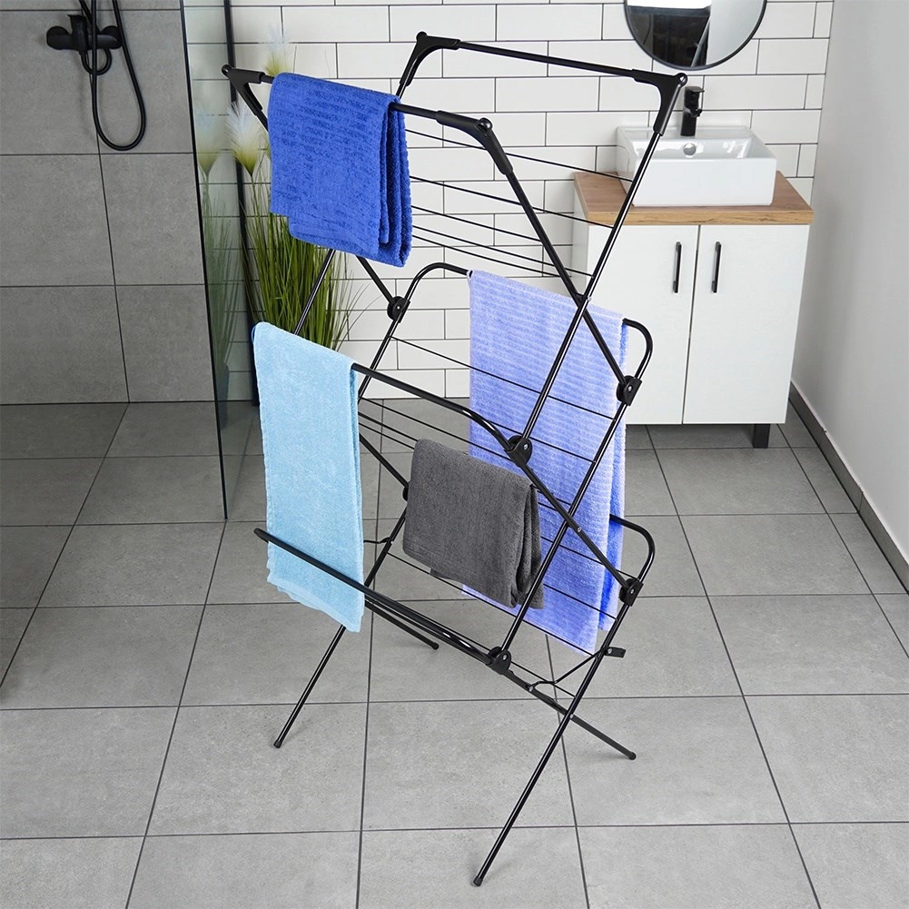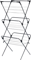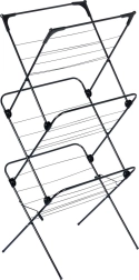Ši vertikali skalbinių džiovyklė elegantiškos juodos spalvos pagaminta iš patvaraus, milteliniu būdu dažyto metalo. Trys lygiai suteikia pakankamai vietos rankšluosčiams, marškiniams ir jautriai apatinei, o stabili X konstrukcija užtikrina saugų naudojimą patalpose ir lauke.