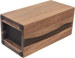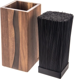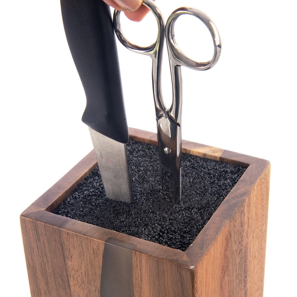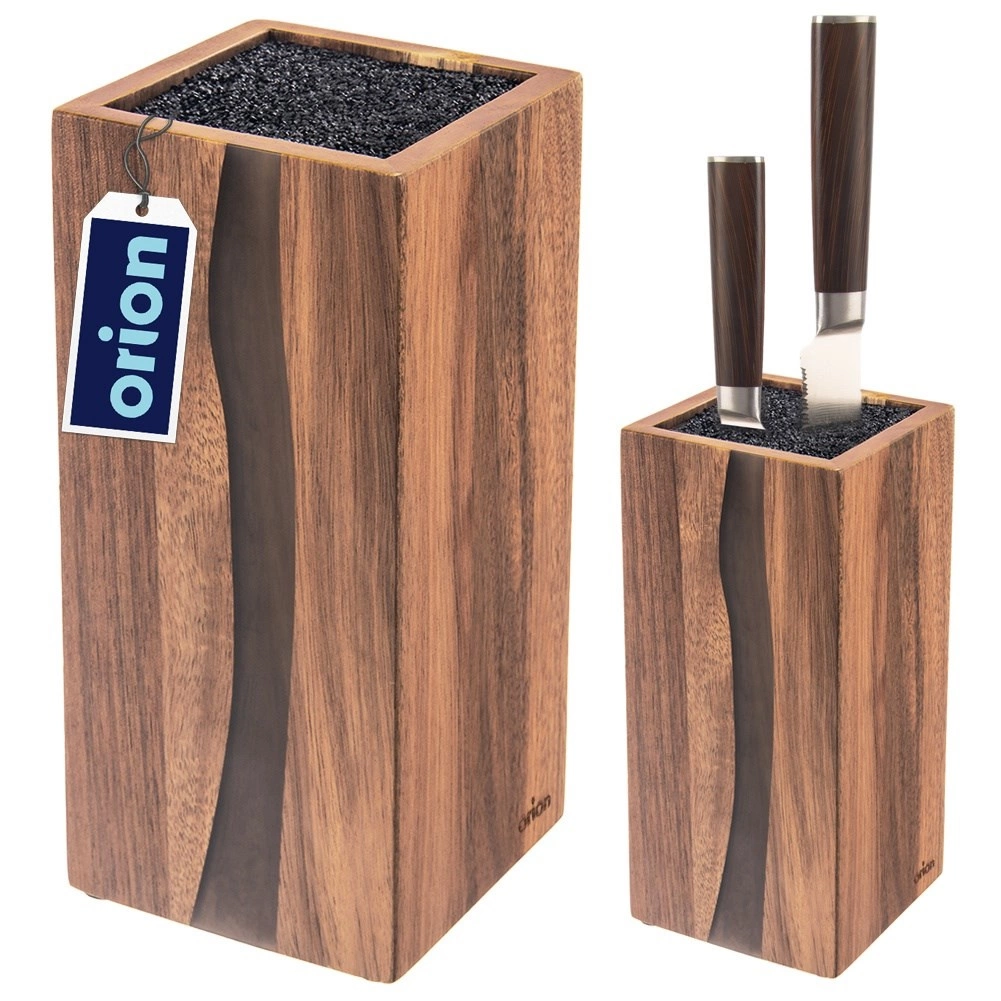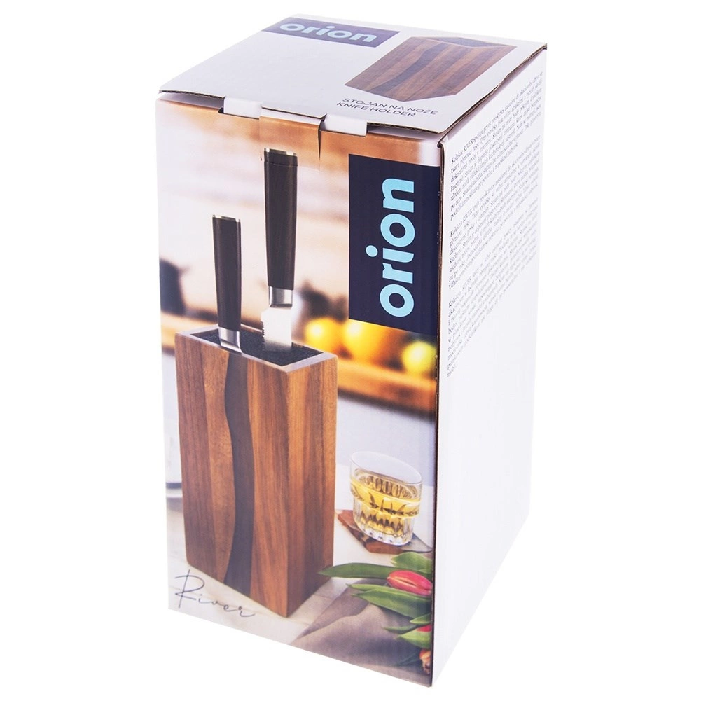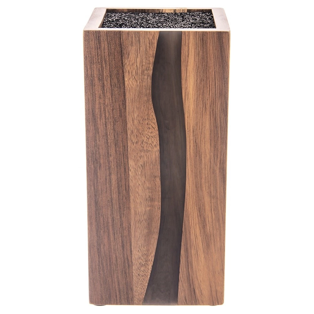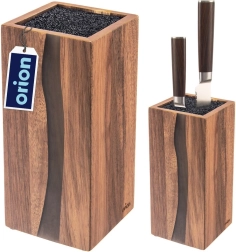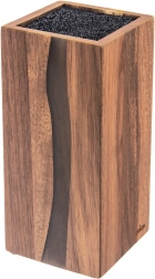 Stilingas ir funkcionalus peilių blokas RIVER pagamintas iš kokybiškos akacijos medienos su dekoratyvine derva, kurios forma primena upės vagą. Dėka universaliojo juodo pluošto viduje galima įstatyti įvairaus dydžio ir formos peilius, įskaitant keraminius ir plieninius, taip pat žirkles ar smulkius virtuvės įrankius. Pluoštinė įdėklė saugiai laiko ašmenis be fiksuotų plyšių ir mažina ašmenų atšipimą.