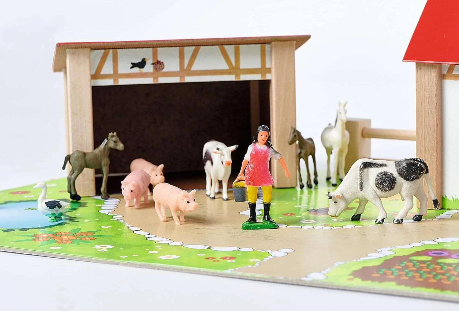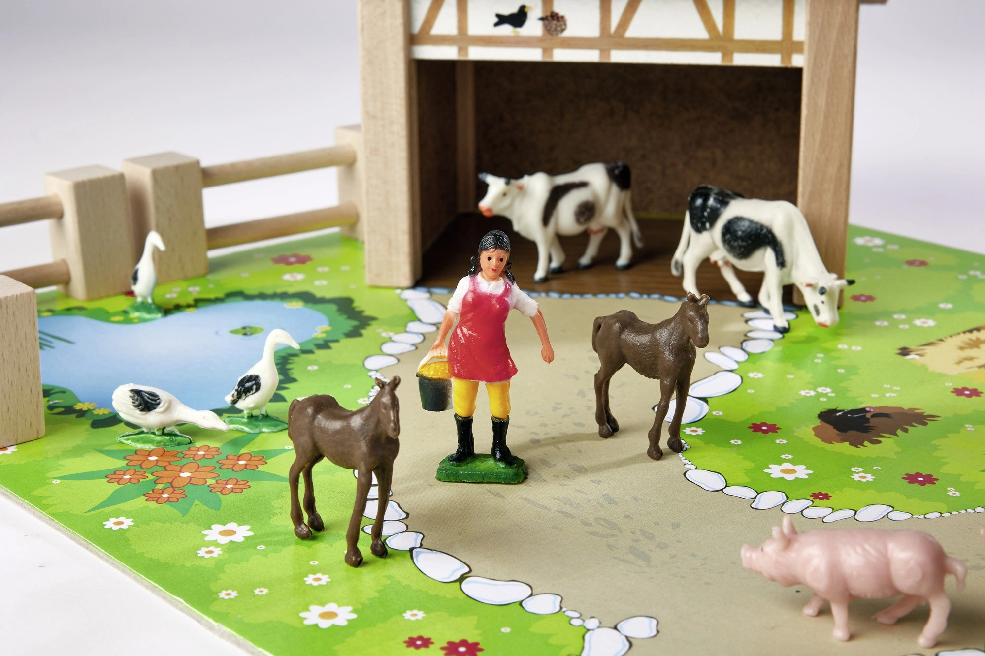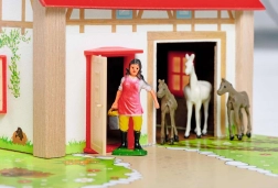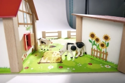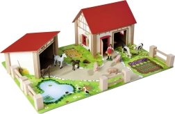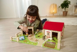 - Namas su tvartu ir arklidėmis, spalvotas pagrindas, tvoros, lipdukai, 12 figūrėlių (gyvūnai ir ūkininko figūrėlė)