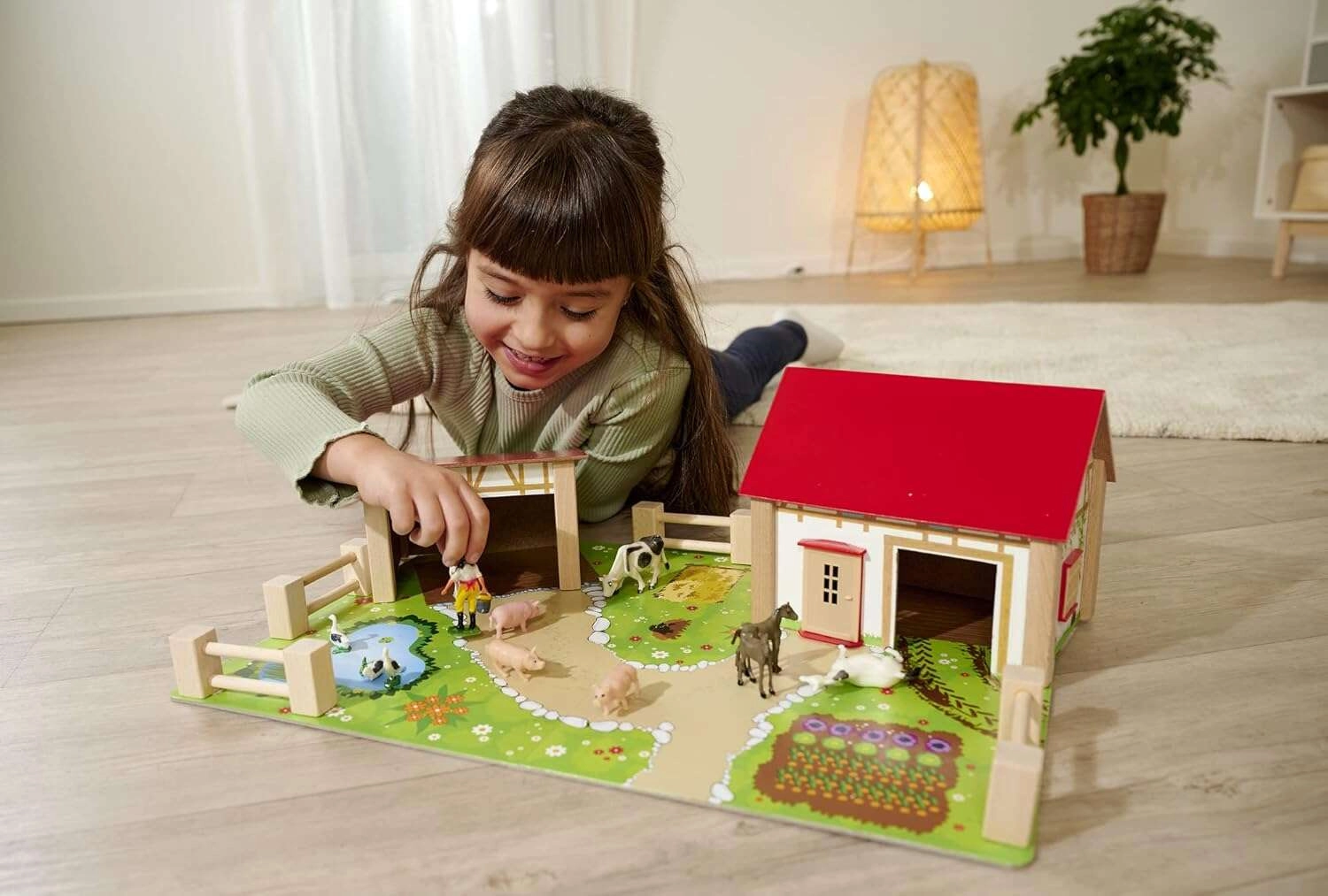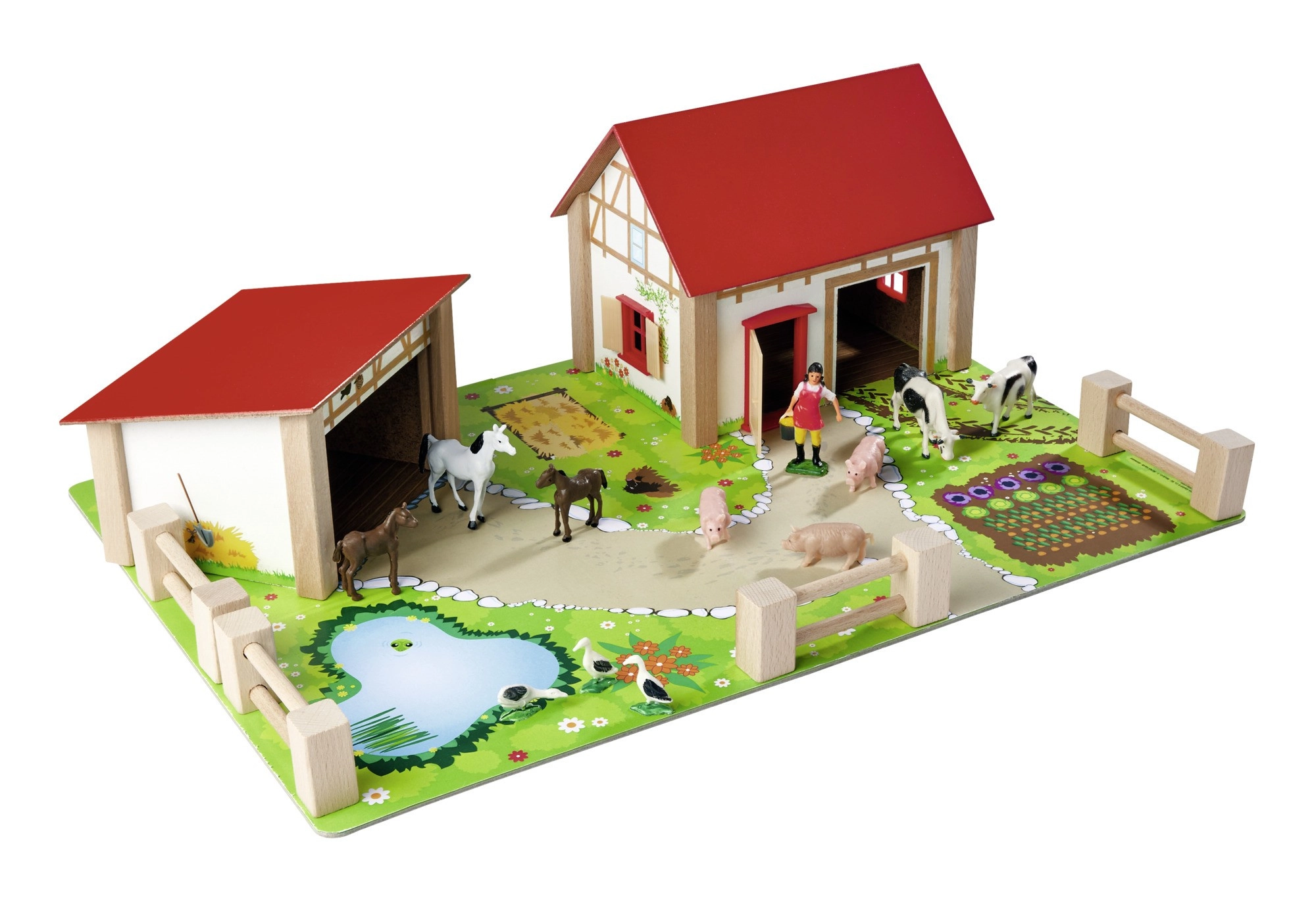 Atraskite kaimo žavesį su EICHHORN mediniu ūkiu, kuris siūlo 25 dalis kūrybiškam žaidimui. Tvirtos medinės pastato dalys, judinamos tvoros ir mielos gyvūnų figūrėlės kviečia vaikus įsivaizduoti, lavinti smulkiąją motoriką ir loginį mąstymą. Spalvotas pagrindas su takeliais, tvenkiniu ir darželiu kuria realistišką ūkio sceną.