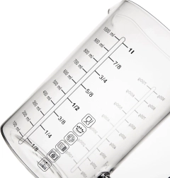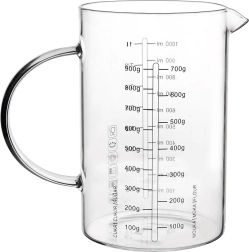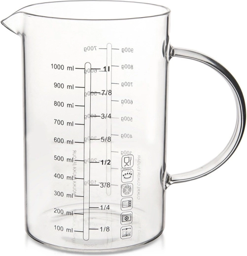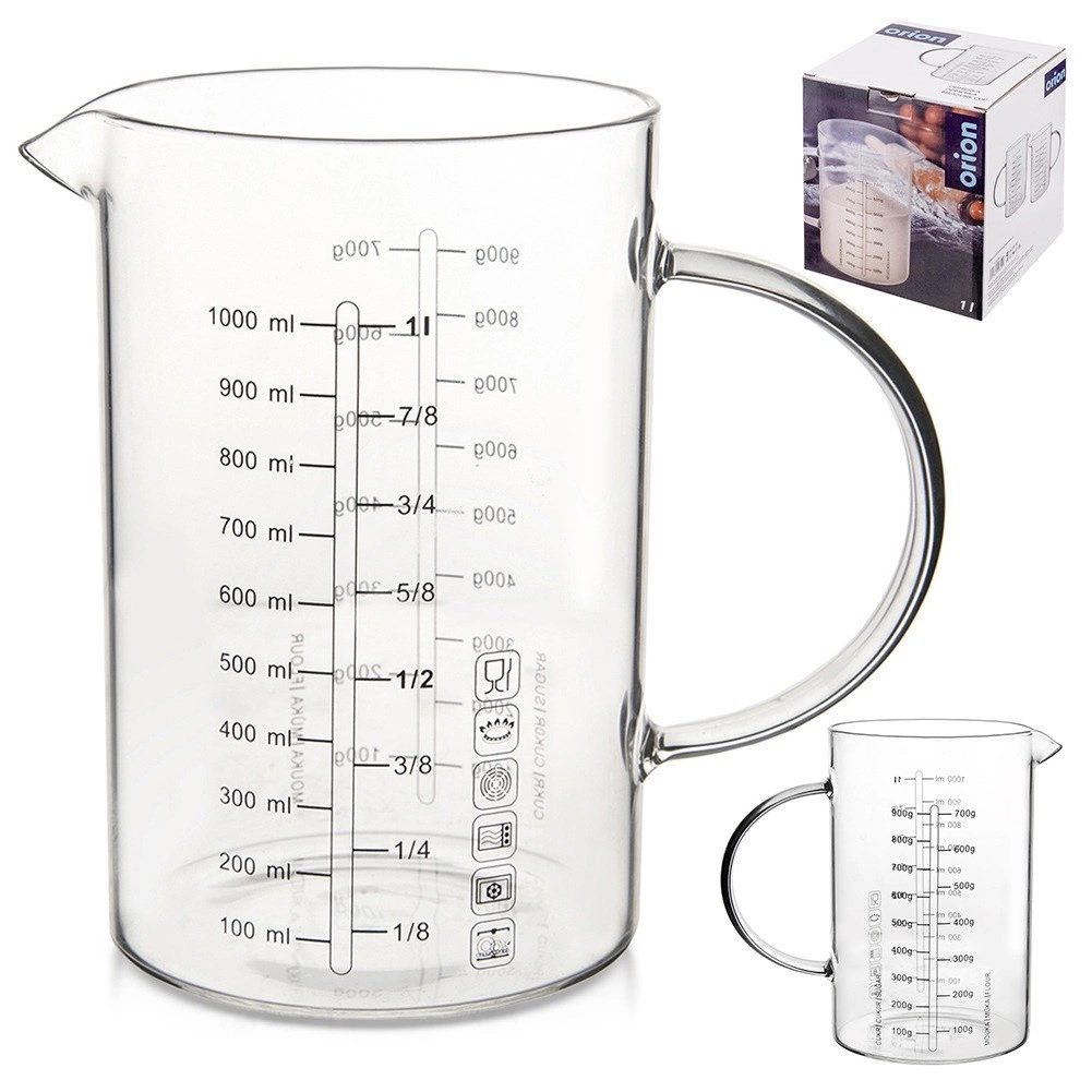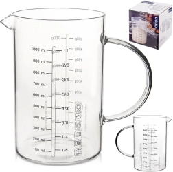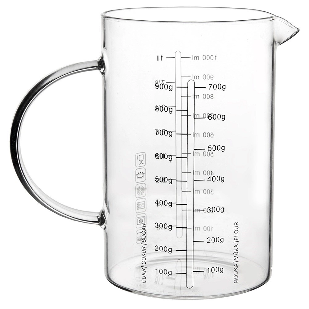 Praktiškas stiklinis ąsotėlio formos matuoklis su rankena ir snapeliu tiksliam skysčių bei birių produktų matavimui. Turi aiškiai įskaitomas skales ml/l ir gramais skirtiems miltams ir cukrui, pagamintas iš borosilikatinio stiklo, atsparus temperatūroms nuo -40 °C iki +300 °C, galima plauti indaplovėje ir naudoti mikrobangų krosnelėje.