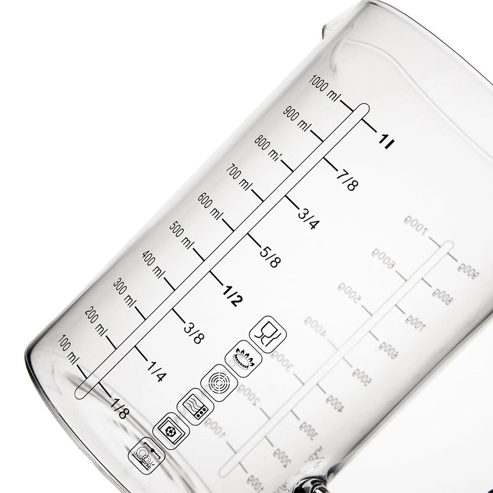Skalės yra gerai įskaitomos ir leidžia greitai bei patikimai matuoti. Čia rasite skysčių matavimą ml (100–1000 ml) ir litrais (1/8 l – 1 l), taip pat perskaičiavimus miltams (100–700 g) ir cukrui (100–900 g). Didžiausia pažymėta talpa yra 1 l, tikrasis ąsotėlio tūris – iki 1,2 l.