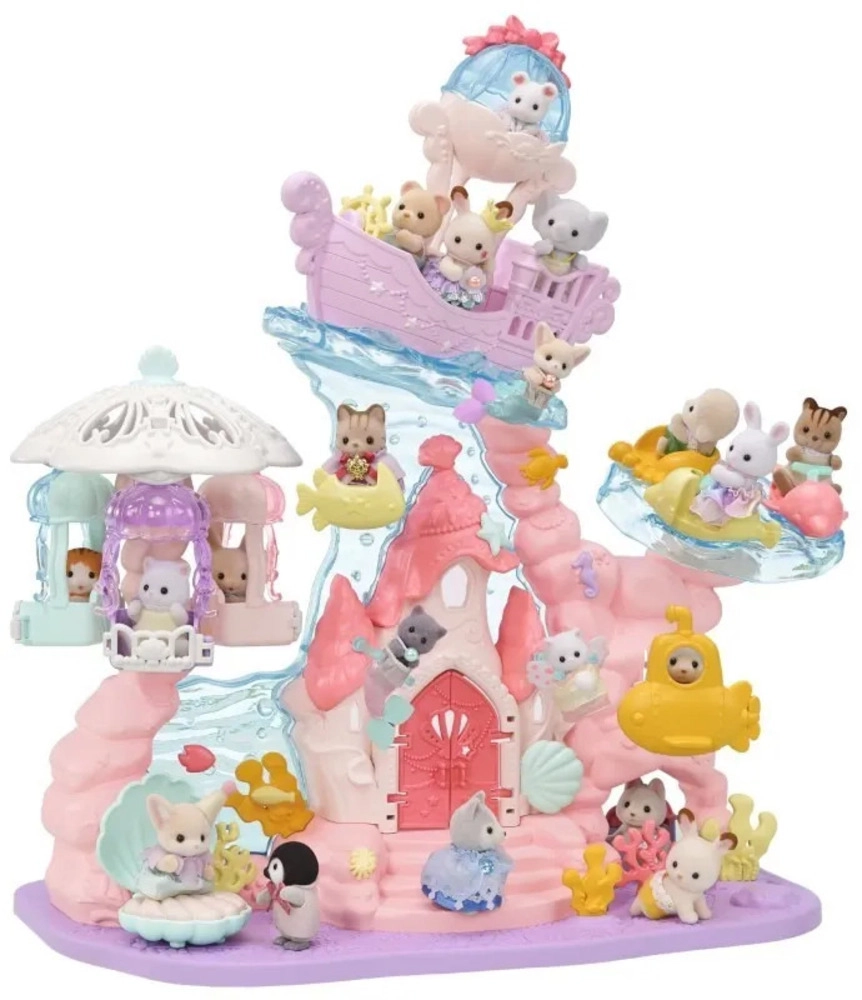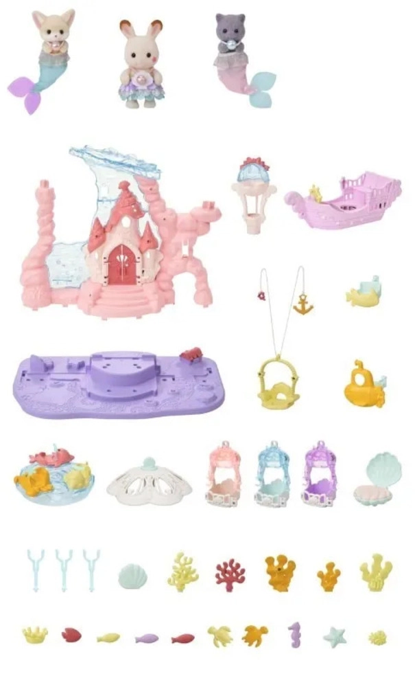 Ženkite į stebuklų pasaulį su povandeniniais rūmais, kupinais interaktyvių funkcijų. Vaikai gali vežioti savo figūrėles keltuvu, sukti karuselę su medūzomis ir jūrų gyvūnais, plaukti povandeniniu laivu arba pasivažinėti ant mielos geltonos žuvelės. Gausios detalės, permatomi elementai ir pastelinių spalvų gama kuria žavingą sceną begalinėms istorijoms.
