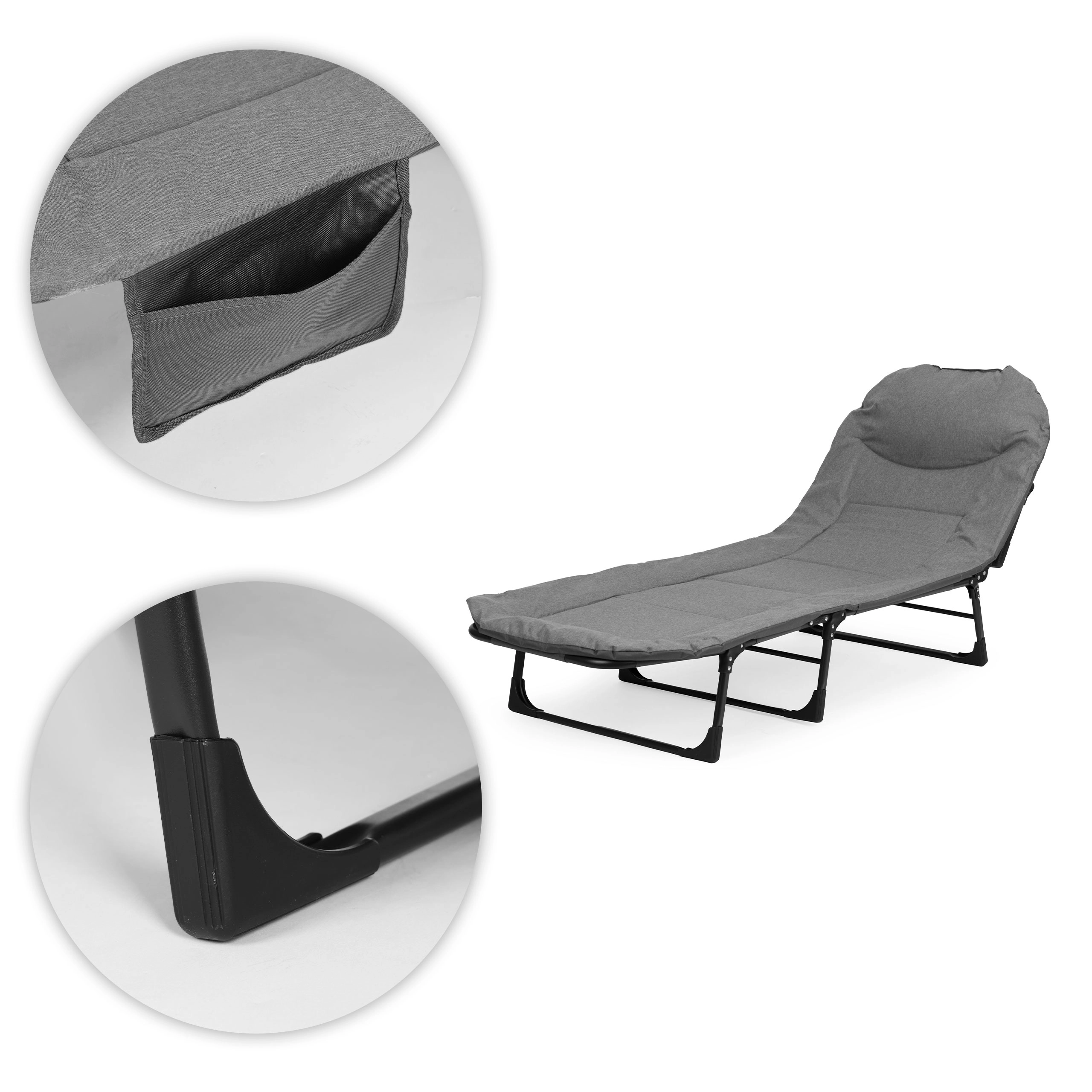 Gultas greitai sulankstomas iki kompaktiškų matmenų, todėl be vargo tilps automobilyje ar spintoje. Šoninė kišenė laikys telefoną, akinius ar knygą po ranka, o minkštas integruotas galvos atlošas padidina patogumą ilgesnio gulėjimo metu.