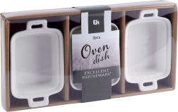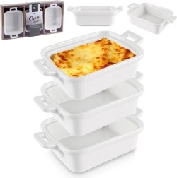 Stilingas trijų porcelianinių kepimo formelių, kurių talpa 160 ml, rinkinys idealiai tinka atskiroms desertų ir sūrių patiekalų porcijoms. Dėl patvarios porceliano konstrukcijos jos yra karščiui atsparios, tinka orkaitei iki 230 °C, mikrobangų krosnelei ir indaplovei. Patogios šoninės rankenėlės užtikrina lengvą naudojimą, o elegantiška balta spalva puikiai dera ant bet kurio stalo.