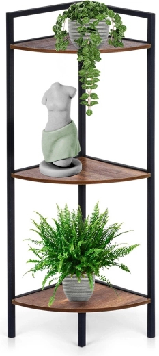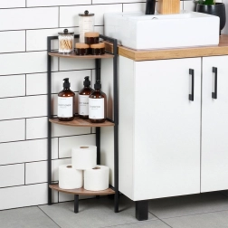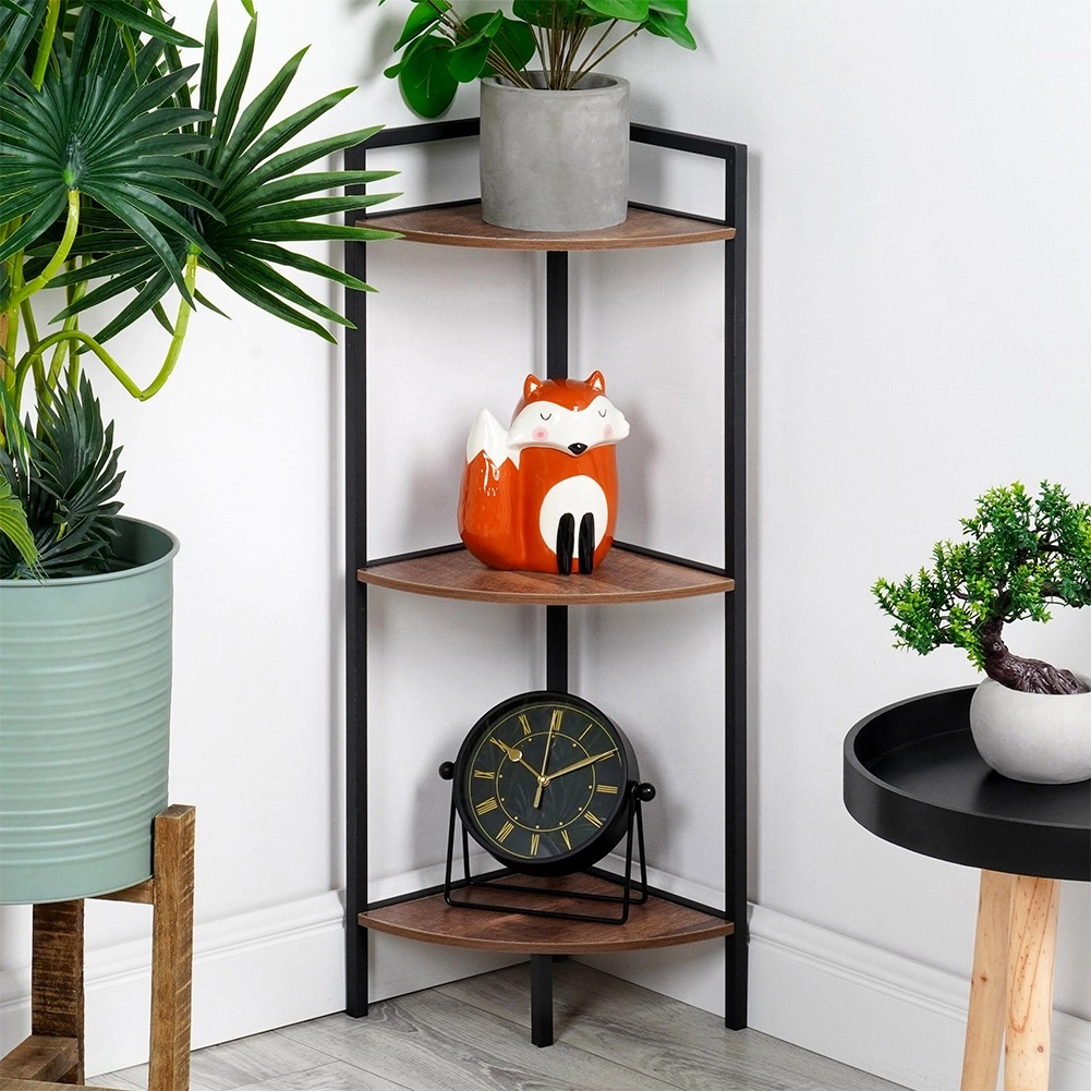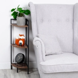 Kampinė lentyna, kurios matmenys 23,5 × 23,5 × 76 cm, yra išmani išeitis ir mažoms, ir didesnėms erdvėms. Minimalistinis dizainas, derinantis juodą metalą ir medžio dekorą, atrodo lengvai ir moderniai, o trys erdvios lentynos užtikrina tvarkingą laikymą ir stilingą mėgstamų daiktų ekspoziciją.