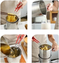 Praktiškas mini puodas su kepimo krepšeliu suteikia saugų ir švarų mėgstamų skanėstų kepimą – nuo bulvyčių ir vištienos gabalėlių iki daržovių. Smulkiai perforuotas krepšelis leidžia greitai nuvarvėti aliejui, todėl maistas būna traškus ir mažiau riebus. 304 nerūdijantis plienas garantuoja ilgaamžiškumą, lengvą priežiūrą ir neutralų skonį.