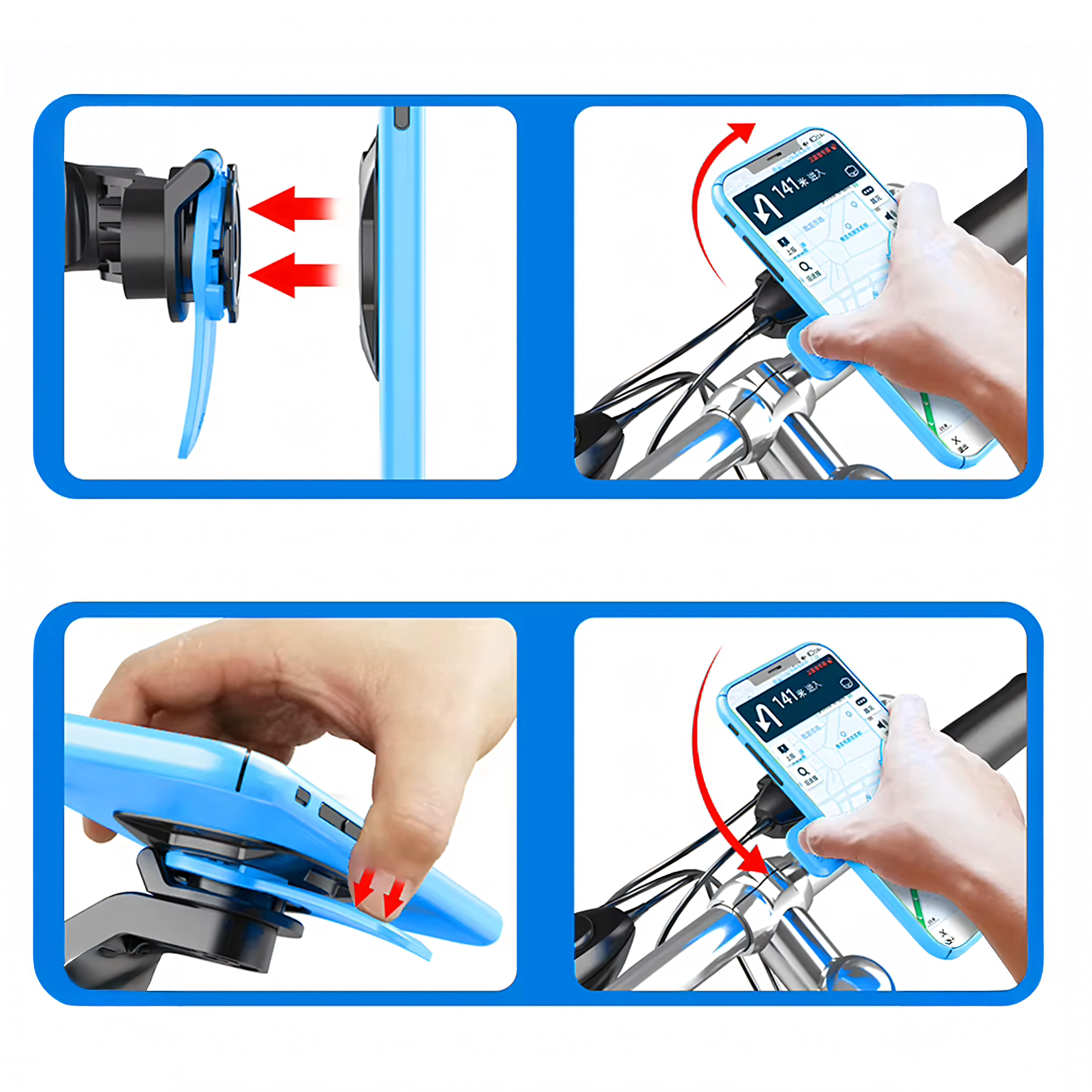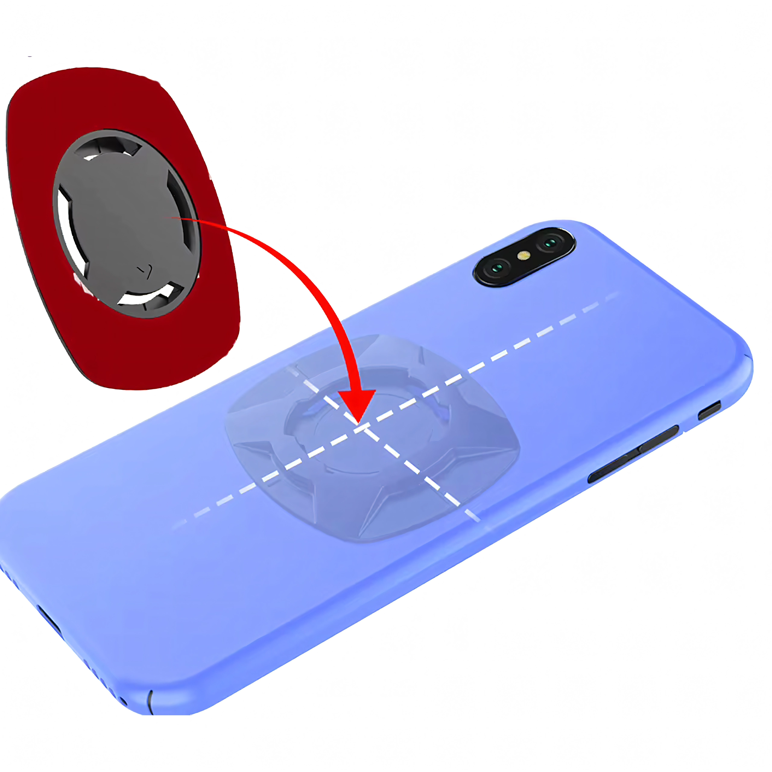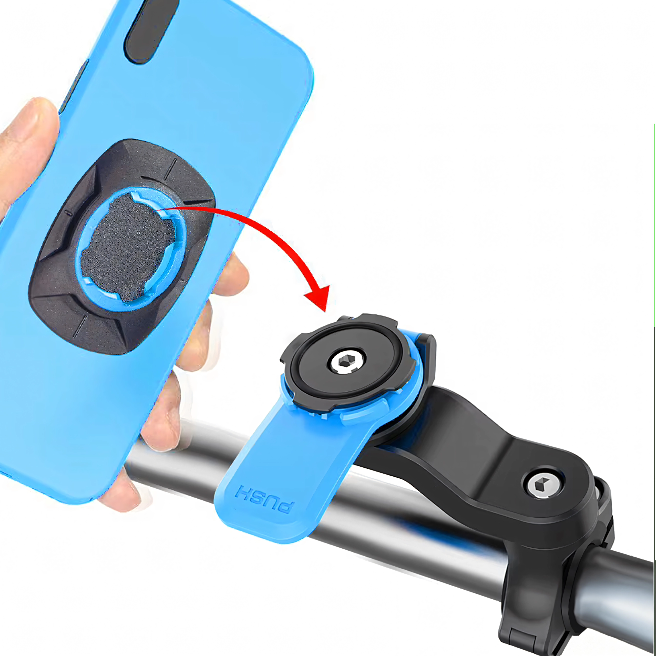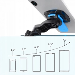 Magnetinis-mechaninis interfeisas su saugikliu leidžia akimirksniu pritvirtinti telefoną viena ranka ir patikimai jį užrakinti net nelygiame paviršiuje.