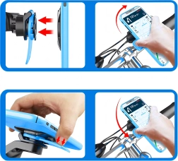 Laikiklis leidžia sklandžiai pasukti telefoną vertikaliai ir horizontaliai, o greitas atlaisvinimas šoniniais mygtukais užtikrina patogų valdymą.