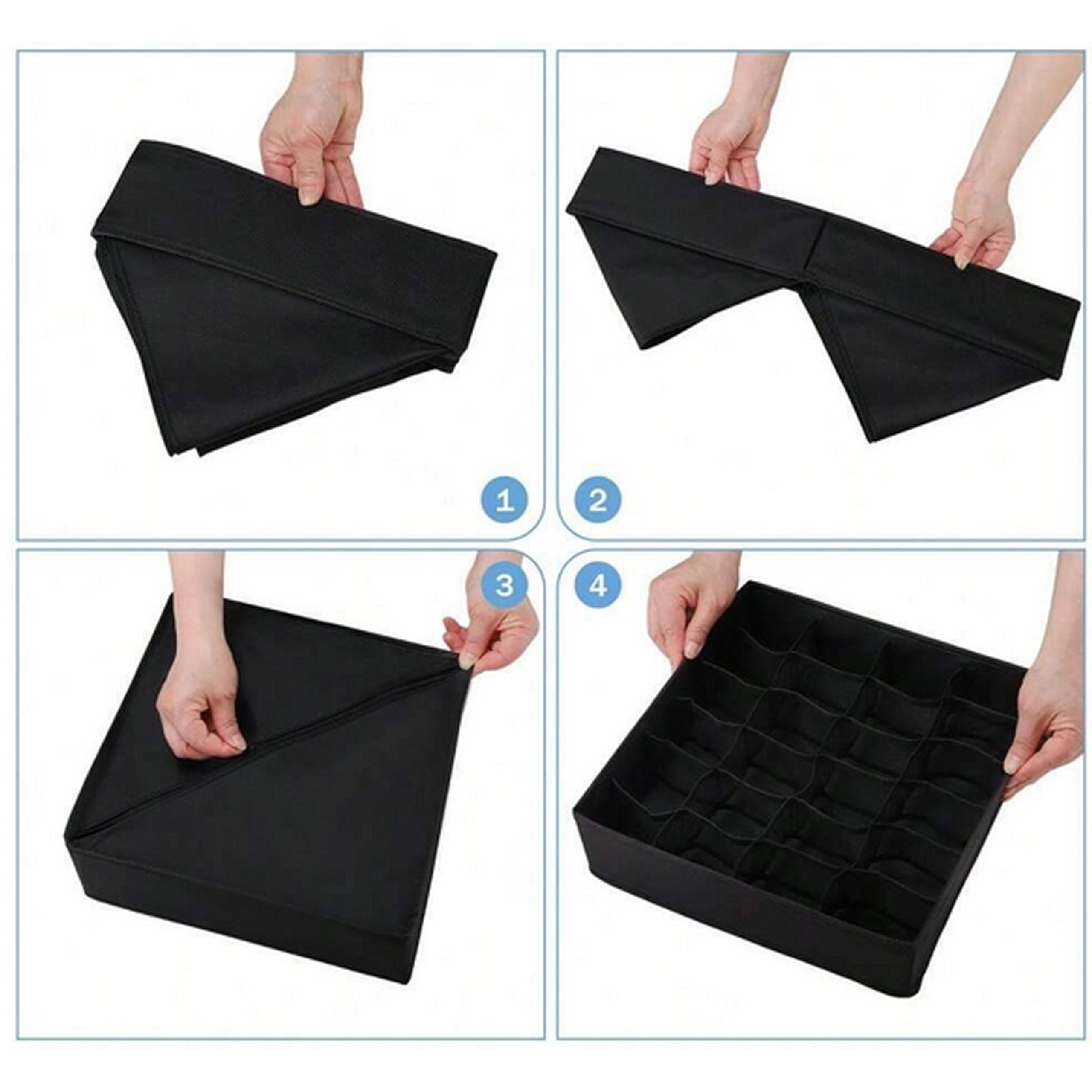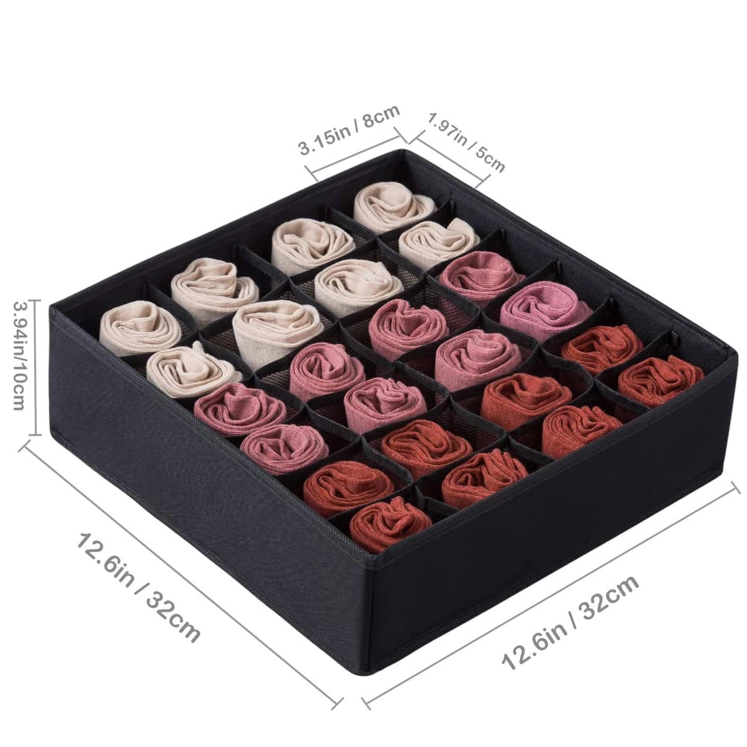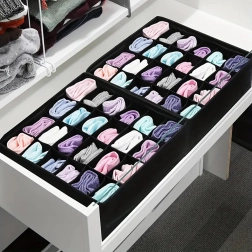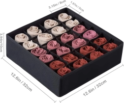 Matmenys 32 × 32 × 10 cm tinka daugumai įprastų stalčių ir atvirų lentynų. Organizatorius puikiai tinka kojinėms, kelnaitėms, liemenėlėms, pėdkelnėms, kaklaraiščiams ir aksesuarams. Surinkimas greitas ir paprastas – viskas paruošta per kelias sekundes.