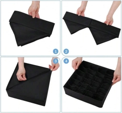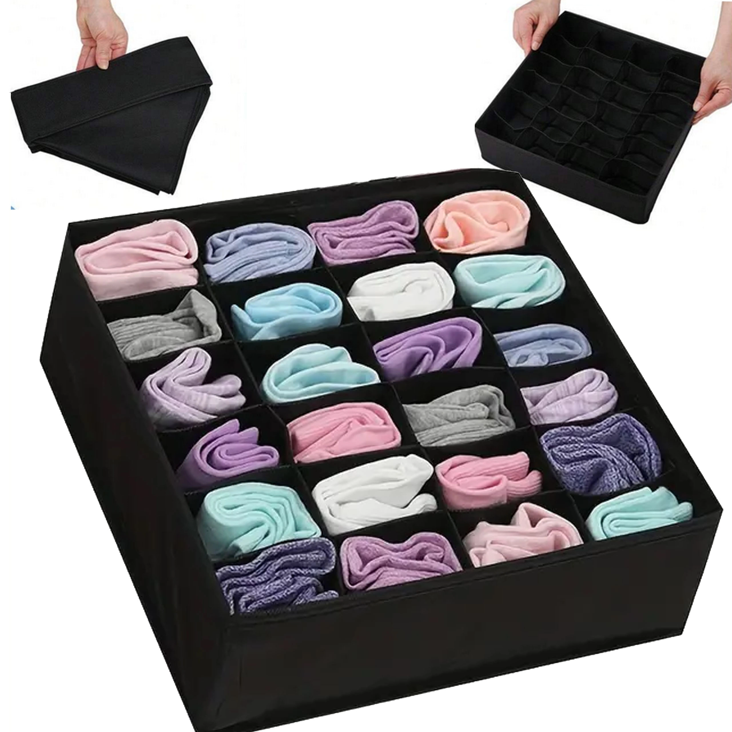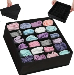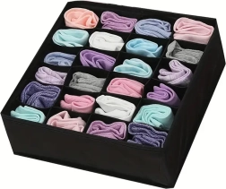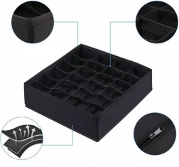 Praktiškas stalčiaus organizatorius padeda suvaldyti chaosą komodoje ir spintoje. Dėl 24 atskirų langelių lengvai surūšiuosite drabužius, o kiekvienas daiktas turės savo vietą. Sustiprintos sienelės išlaiko formą ir palengvina naudojimą, o kvėpuojantis neaustinis audinys užtikrina oro cirkuliaciją.
