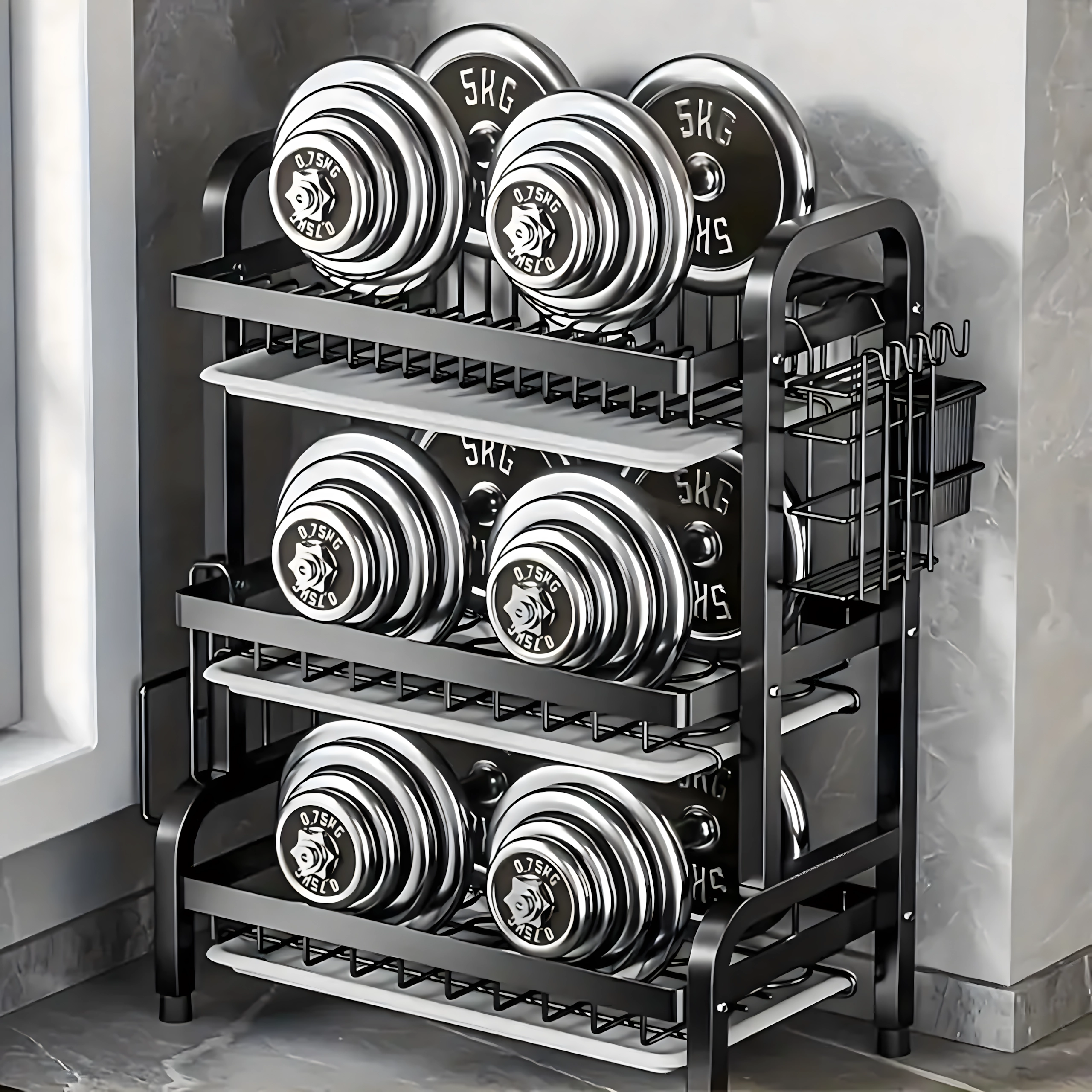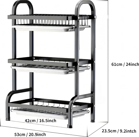 Šis didelės talpos, trijų lygių XXL indų džiovintuvas derina tvirtą metalinę konstrukciją su švaria, modernia išvaizda. Dėl nuo rūdžių atsparaus nerūdijančio plieno ir lengvai išimamų lašėjimo padėklų virtuvės stalviršis išlieka sausas ir tvarkingas.