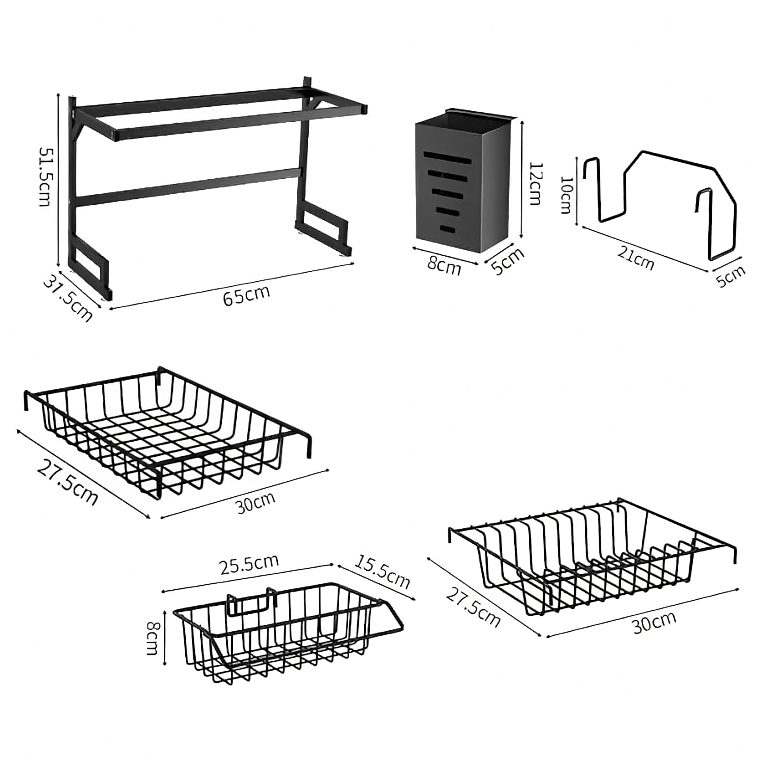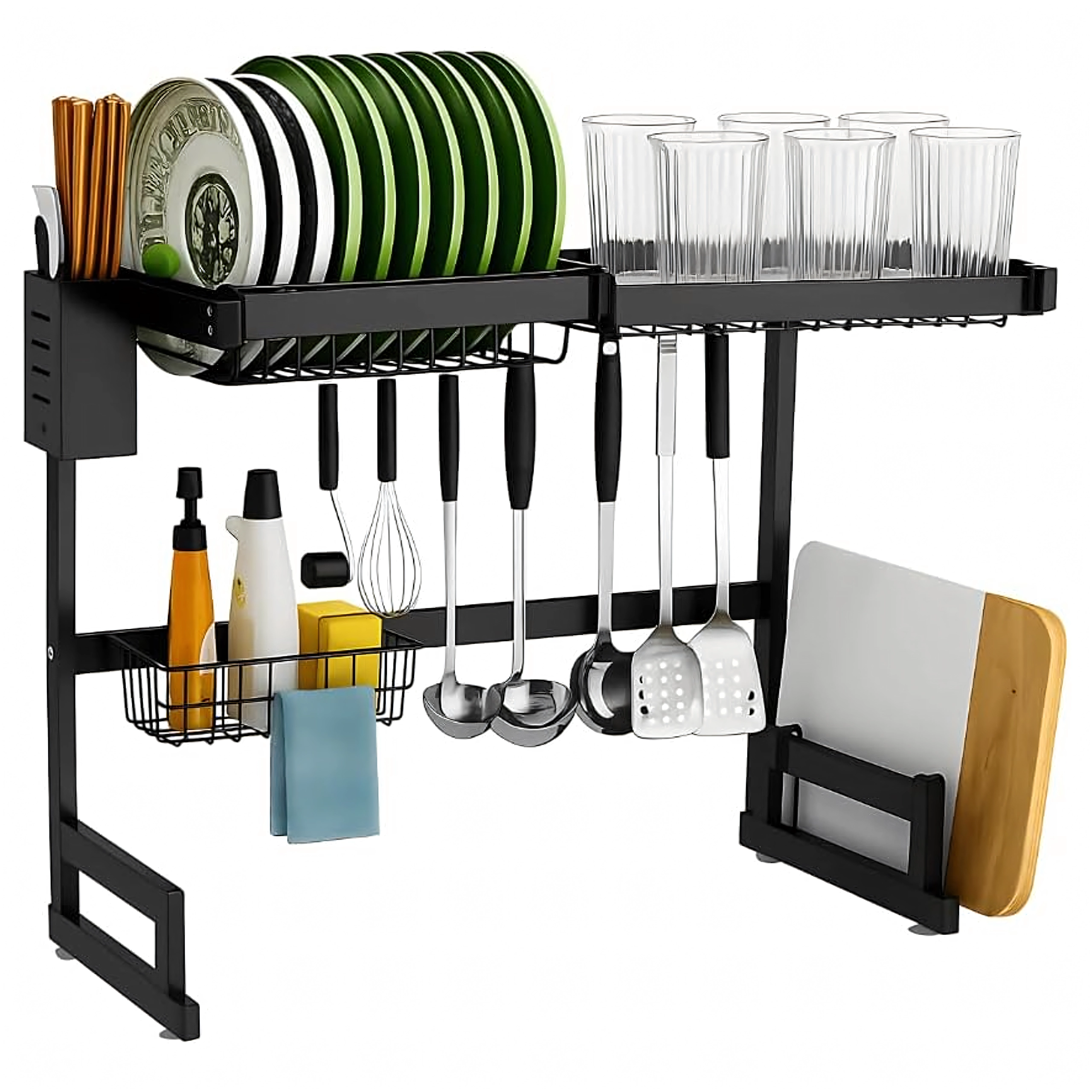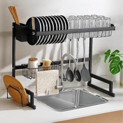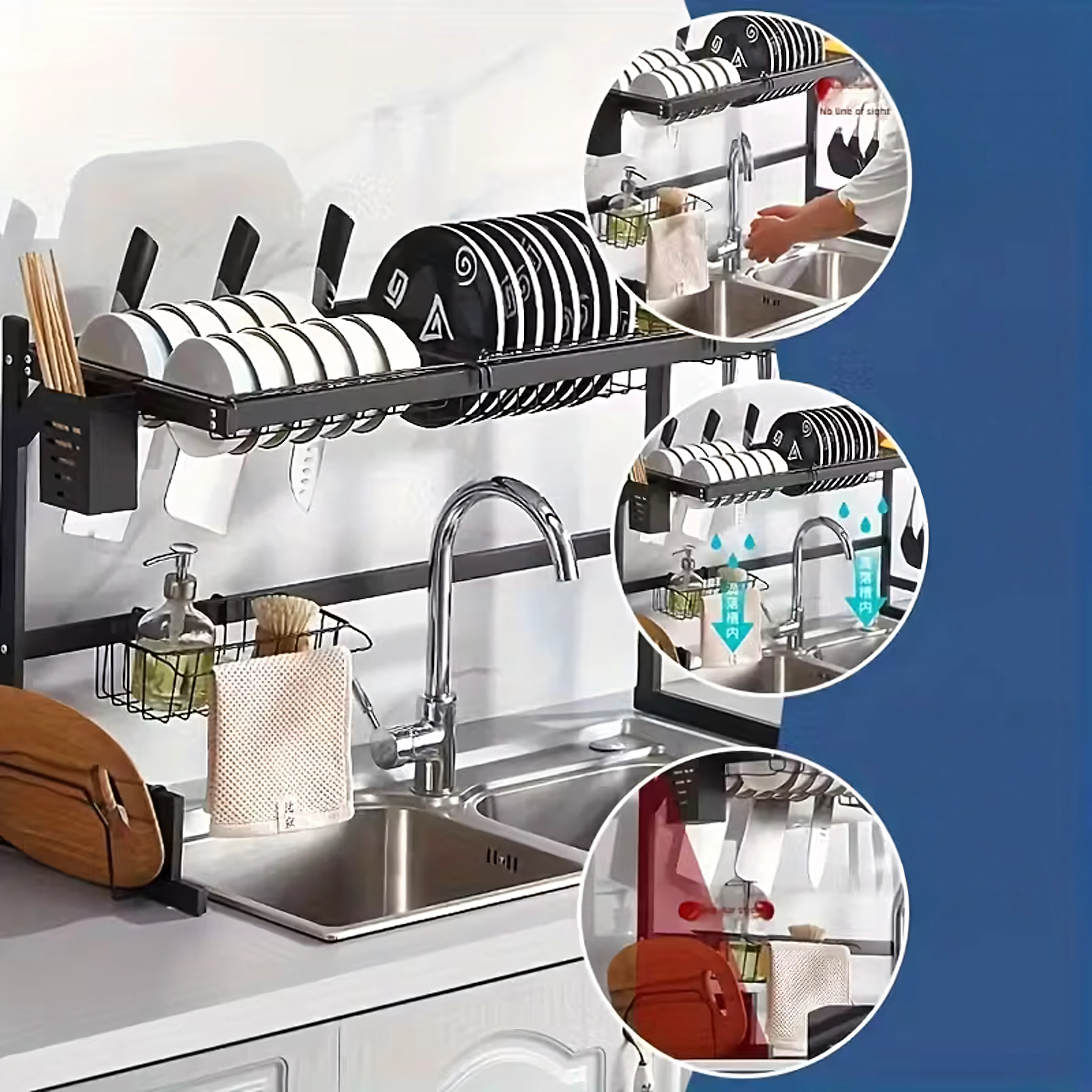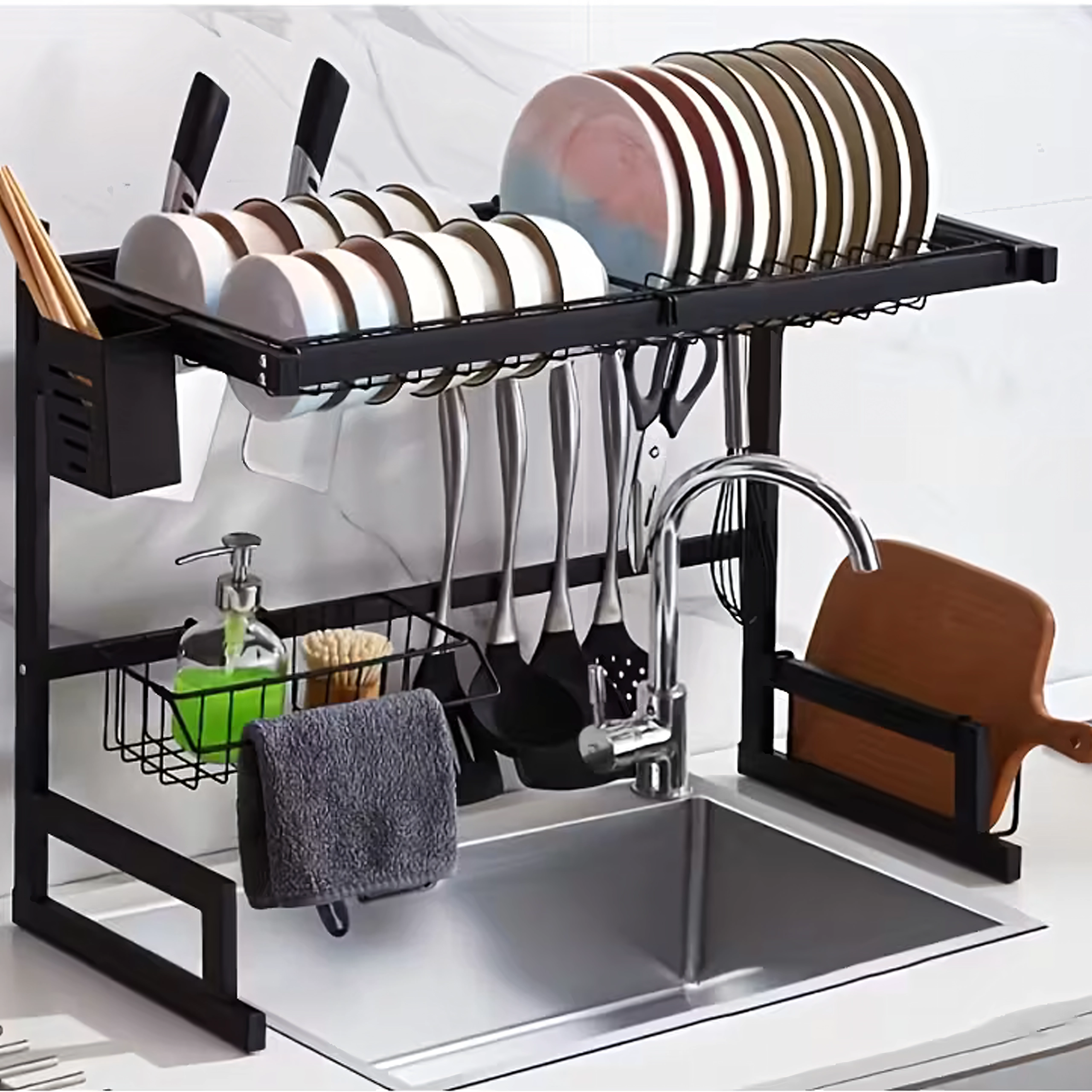 Viršutinis aukštas skirtas lėkštėms ir dubenėliams, apatiniai krepšeliai – stiklinėms ir indams. Vanduo nubėga tiesiai į plautuvę, o stalviršis išlieka sausas ir tvarkingas.