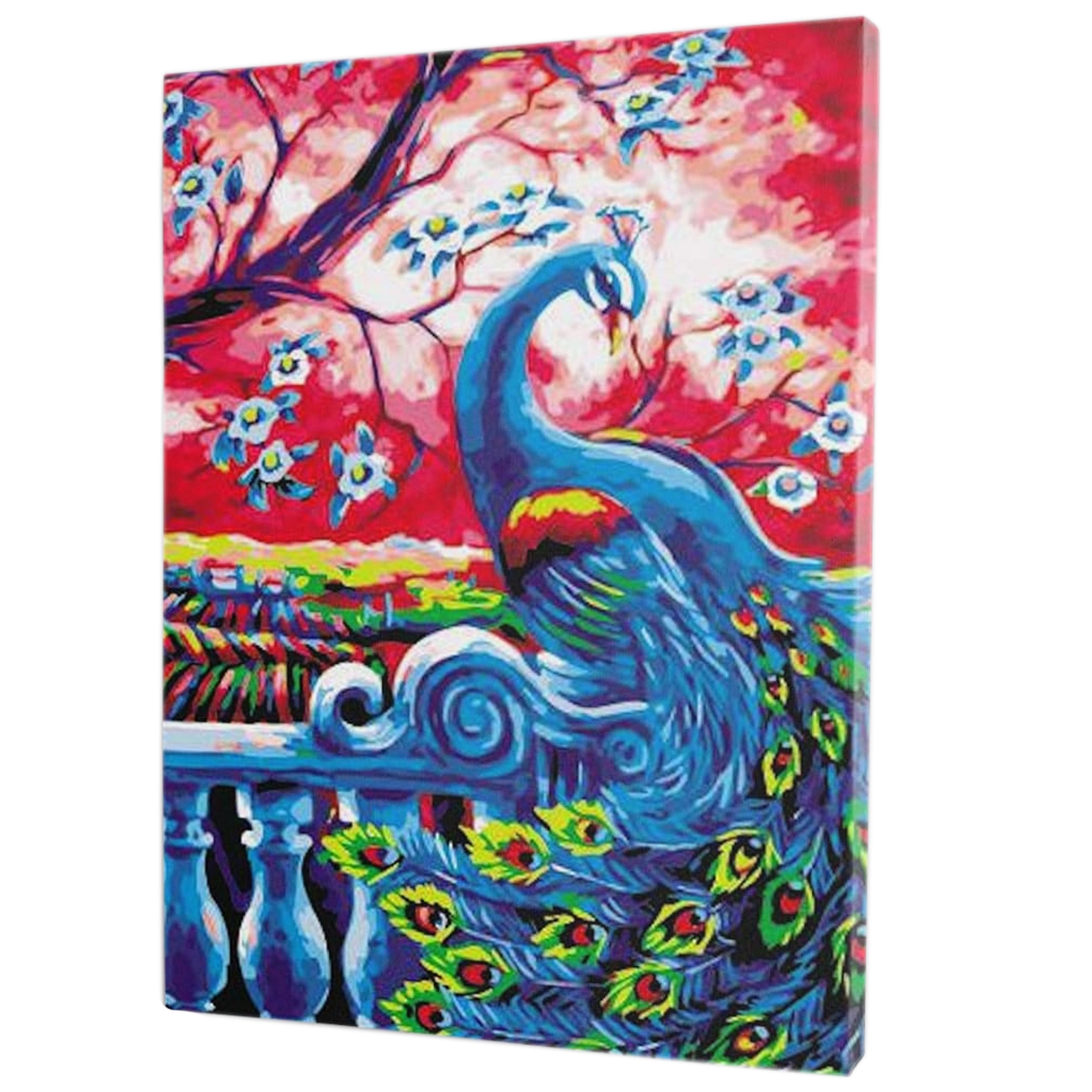 Išsamus rinkinys su drobe ant rėmo, dažais ir teptukais. Baigtą paveikslą su povo motyvu galite iš karto pakabinti.