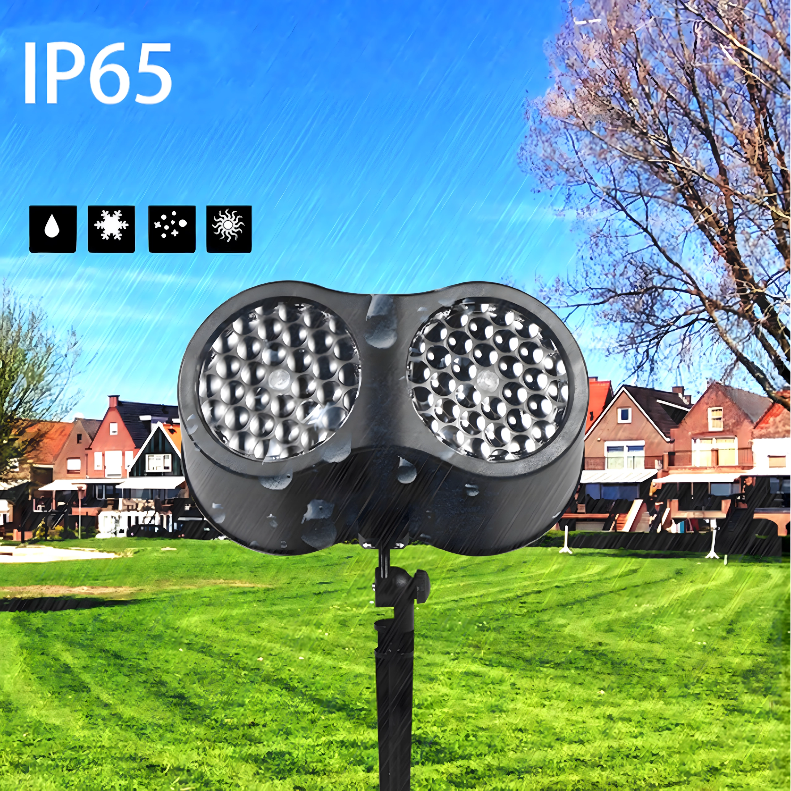 Dėl IP65 apsaugos projektorius pasiruošęs žiemai – atsparus lietui, sniegui ir šalčiui. Reguliuojamas laikiklis ir įžeminamas kaištis palengvina montavimą sode, o stabilus pagrindas idealus naudojimui viduje. Su nuotolinio valdymo pultu (iki 25 m) pakeisite efektus ir nustatysite 2–4–6 val. laikmatį neišeidami į lauką.