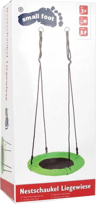 Žalias SMALL FOOT supamas tinklas „gandro lizdas“ pavers kiekvieną sodą, terasą ar vaikų kambarį ramybės ir pramogų oaze. Dėl minkšto, patogaus krašto ir apvalios formos jis suteikia saugią ir jaukią vietą skaityti, ilsėtis ir suptis. Metaliniai žiedai palengvina greitą pakabinimą, o patvarios medžiagos užtikrina ilgą tarnavimo laiką.