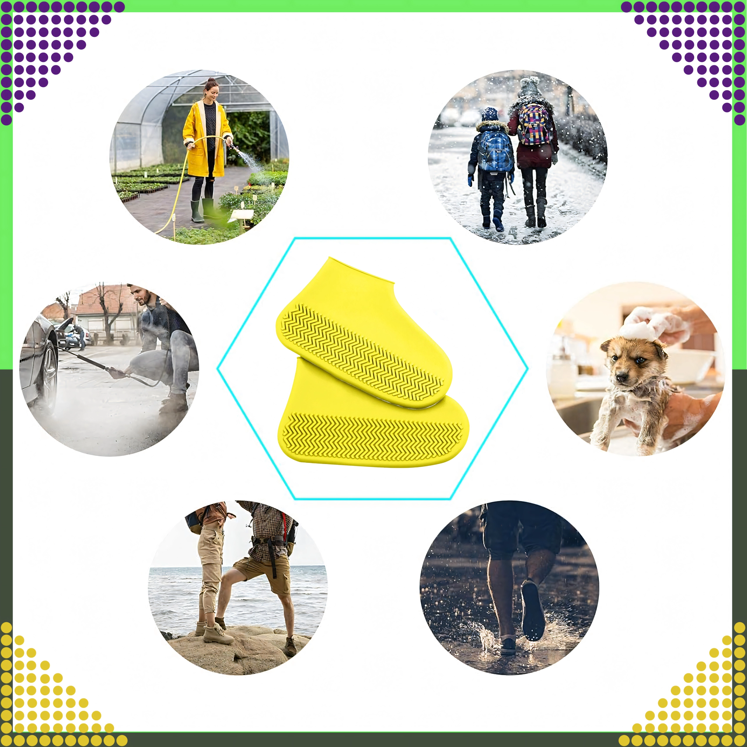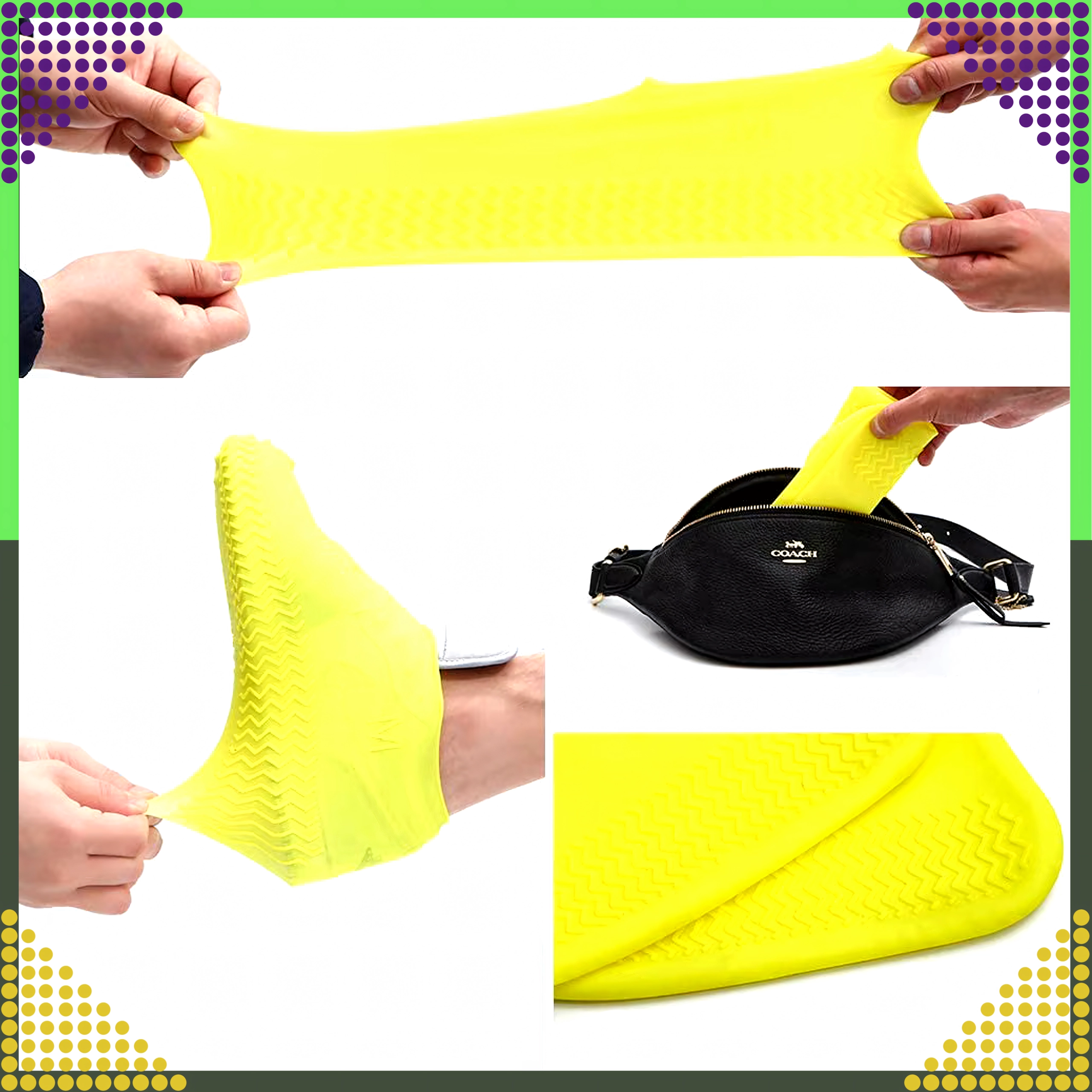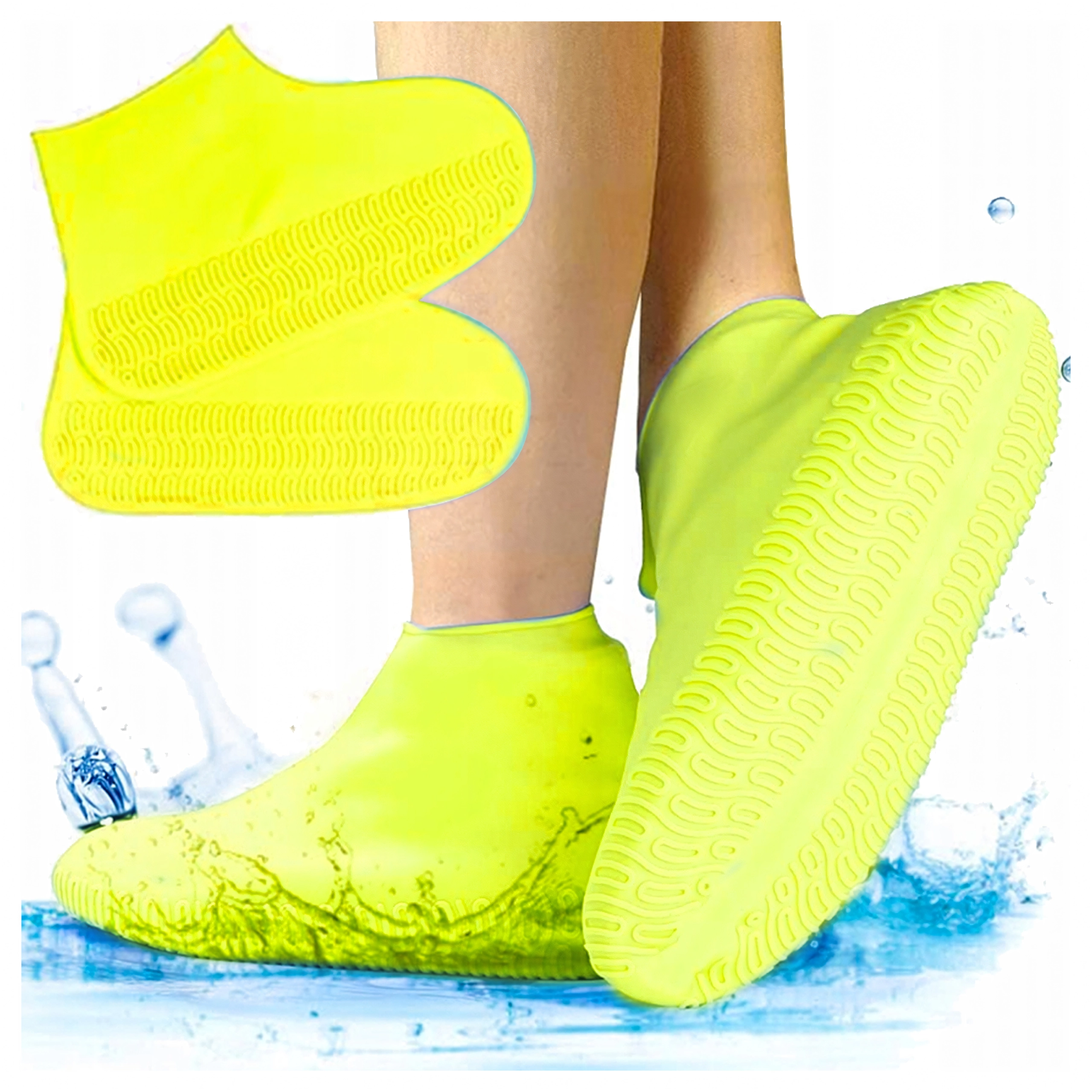 Išlaikykite savo batus švarius ir sausus bet kokiu oru. Geltonos spalvos silikoninės užmaunamos apsaugos pagamintos iš kokybiškos elastingos medžiagos, kuri puikiai priglunda prie avalynės ir atspari vandeniui, purvui bei sniegui. Neslystanti pado struktūra didina ėjimo saugumą ant šlapio paviršiaus.