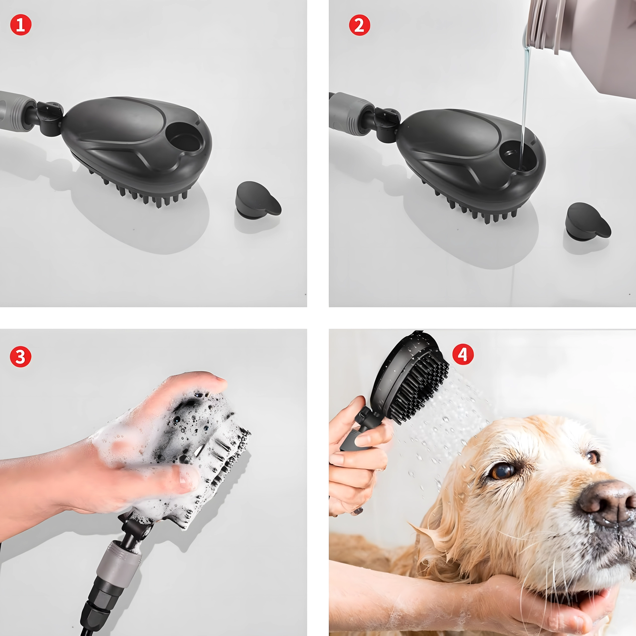 Minkšti guminiai šereliai atpalaiduoja nešvarumus ir švelniai masažuoja odą. Integruota vandens srovė vienu žingsniu nuplauna šampūną ir purvą.