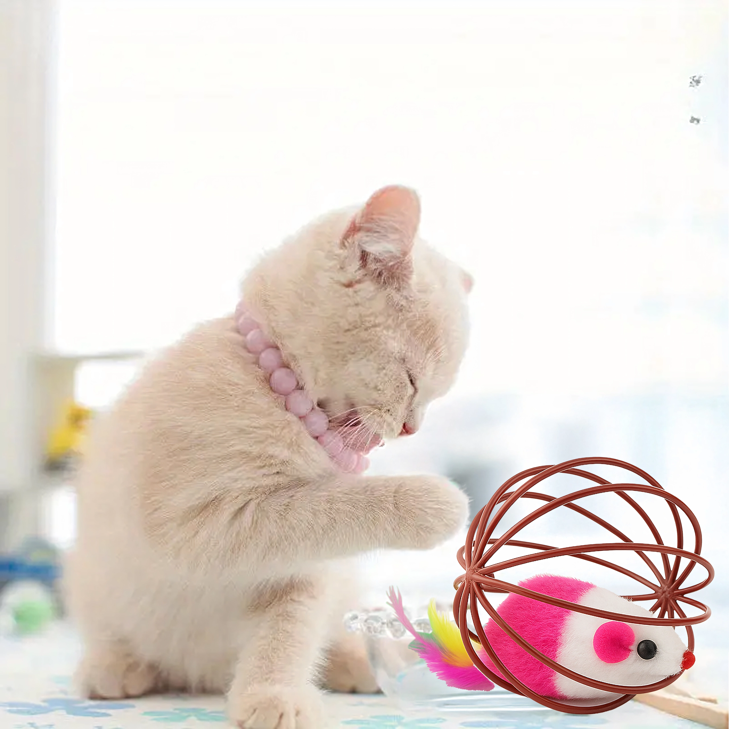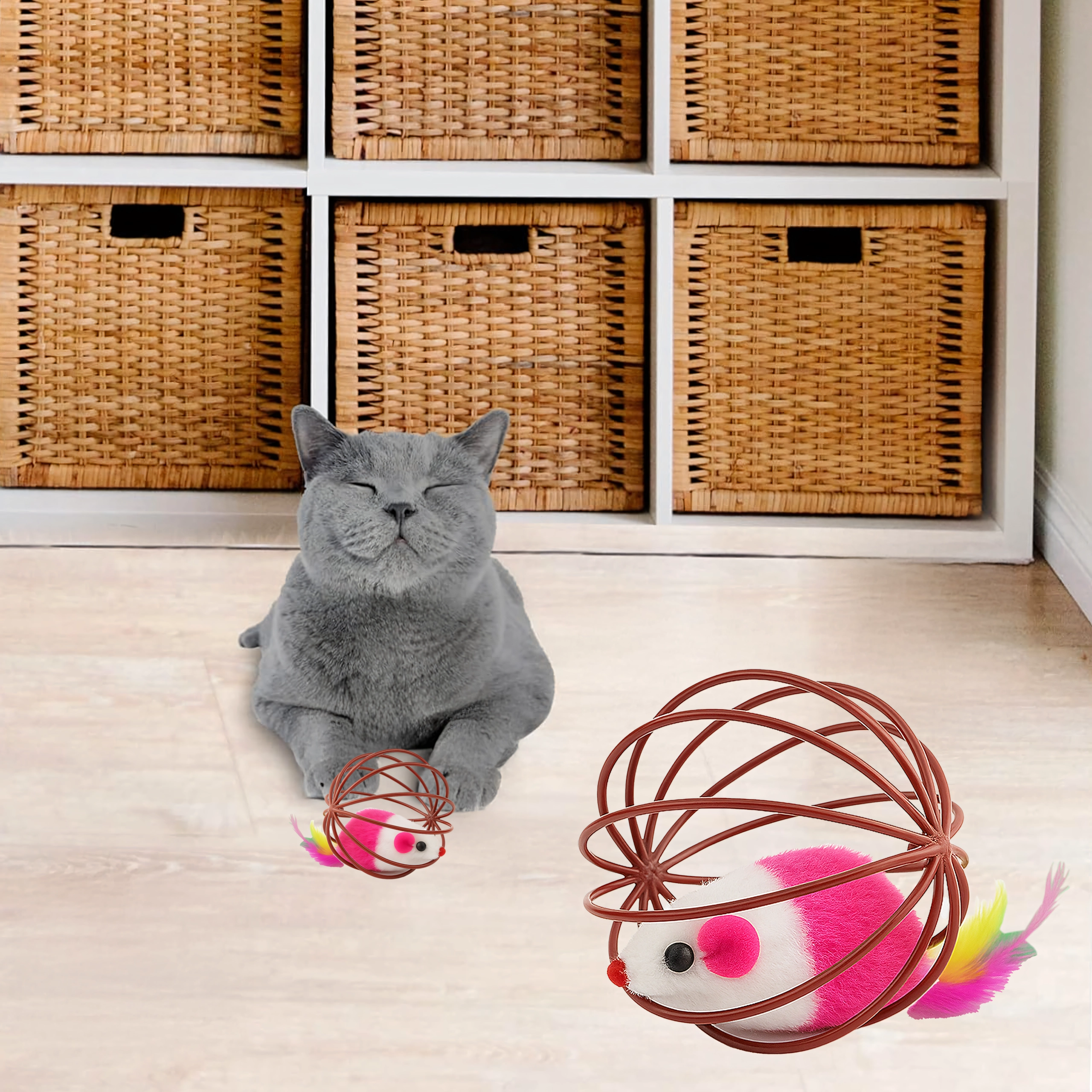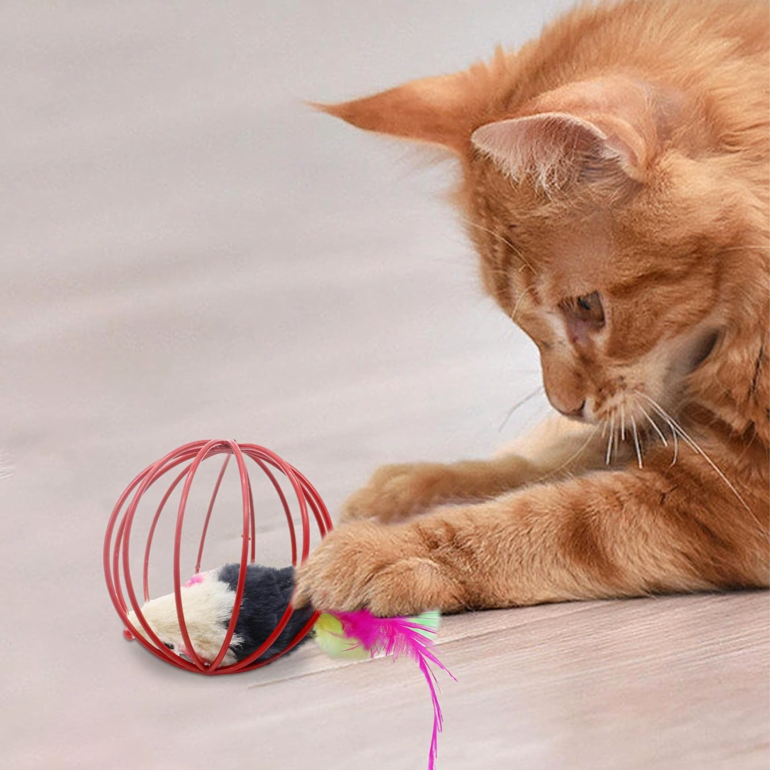 Dėl patvarios vielinės konstrukcijos žaislas lengvai rieda, bet pelytė išlieka saugiai viduje. Atvira struktūra leidžia katei patogiai sugriebti ir stumdyti žaislą, o minkštas pliušas ir plunksnelės suteikia patrauklių tekstūrų. Puikus pasirinkimas savarankiškam ir interaktyviam žaidimui su šeimininku.