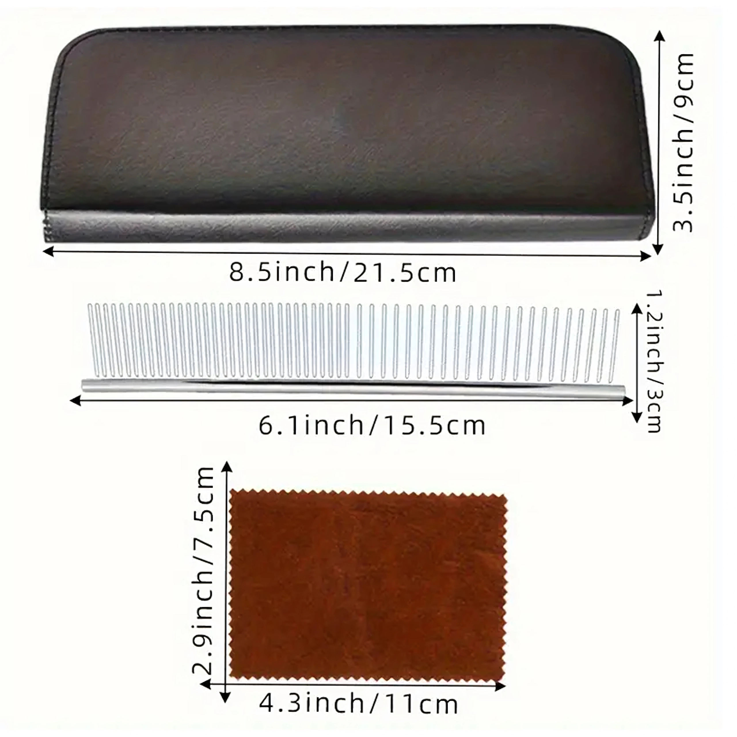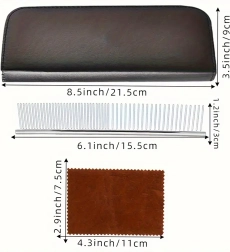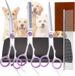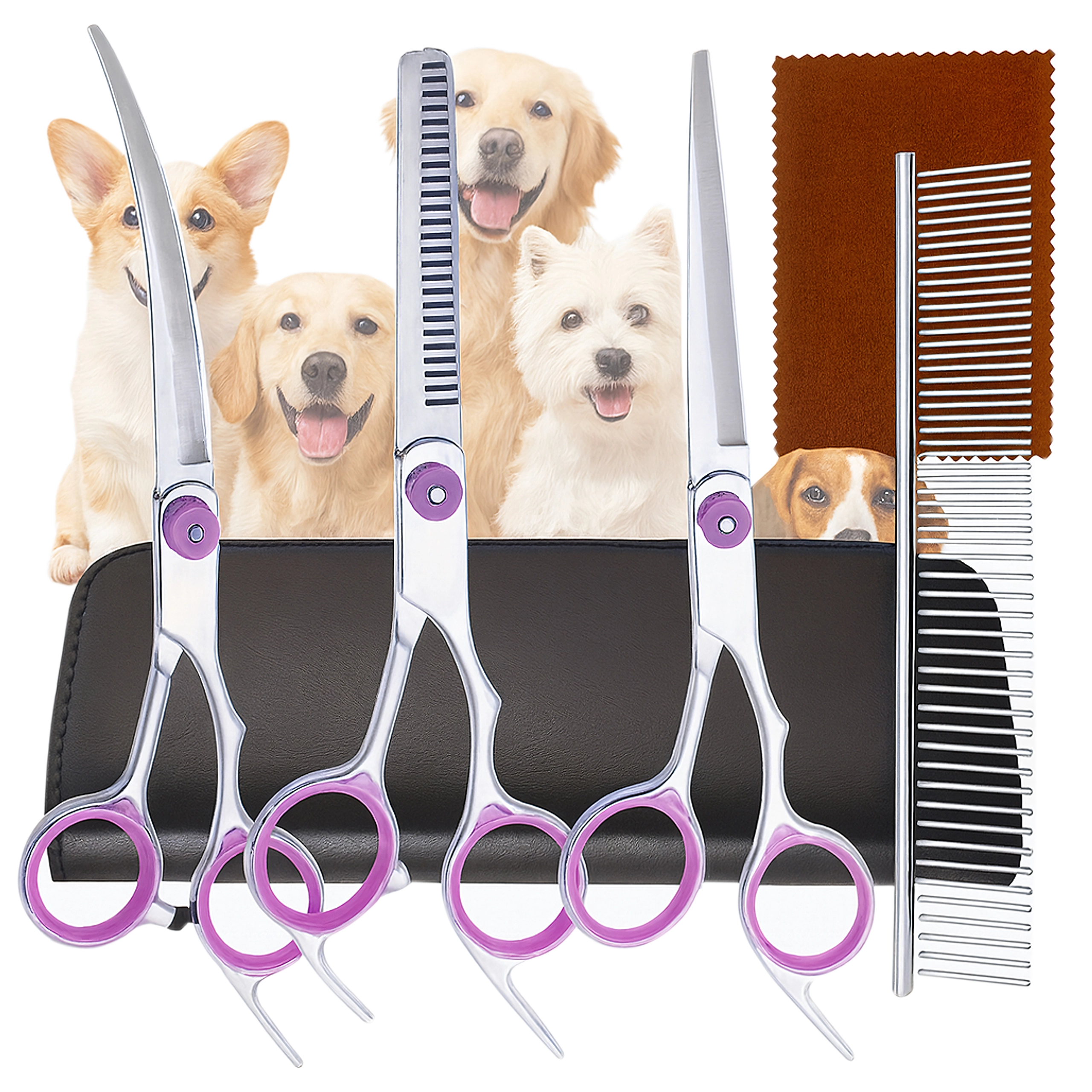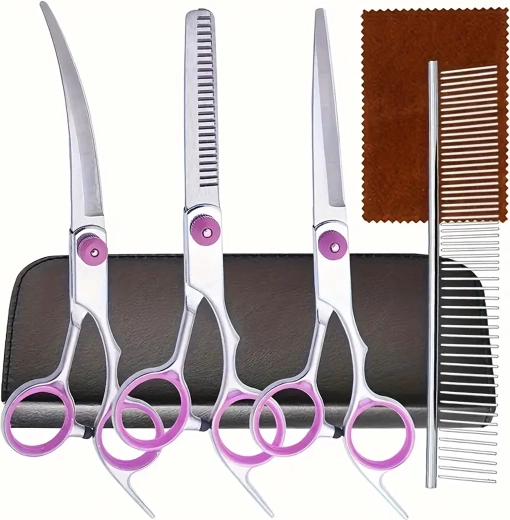 Trys žirklių tipai (tiesios, lenktos, filiravimo) + metalinės šukos apsauginiame dėkle. Viskas kirpimui, formavimui ir kailio retinimui vienoje vietoje.