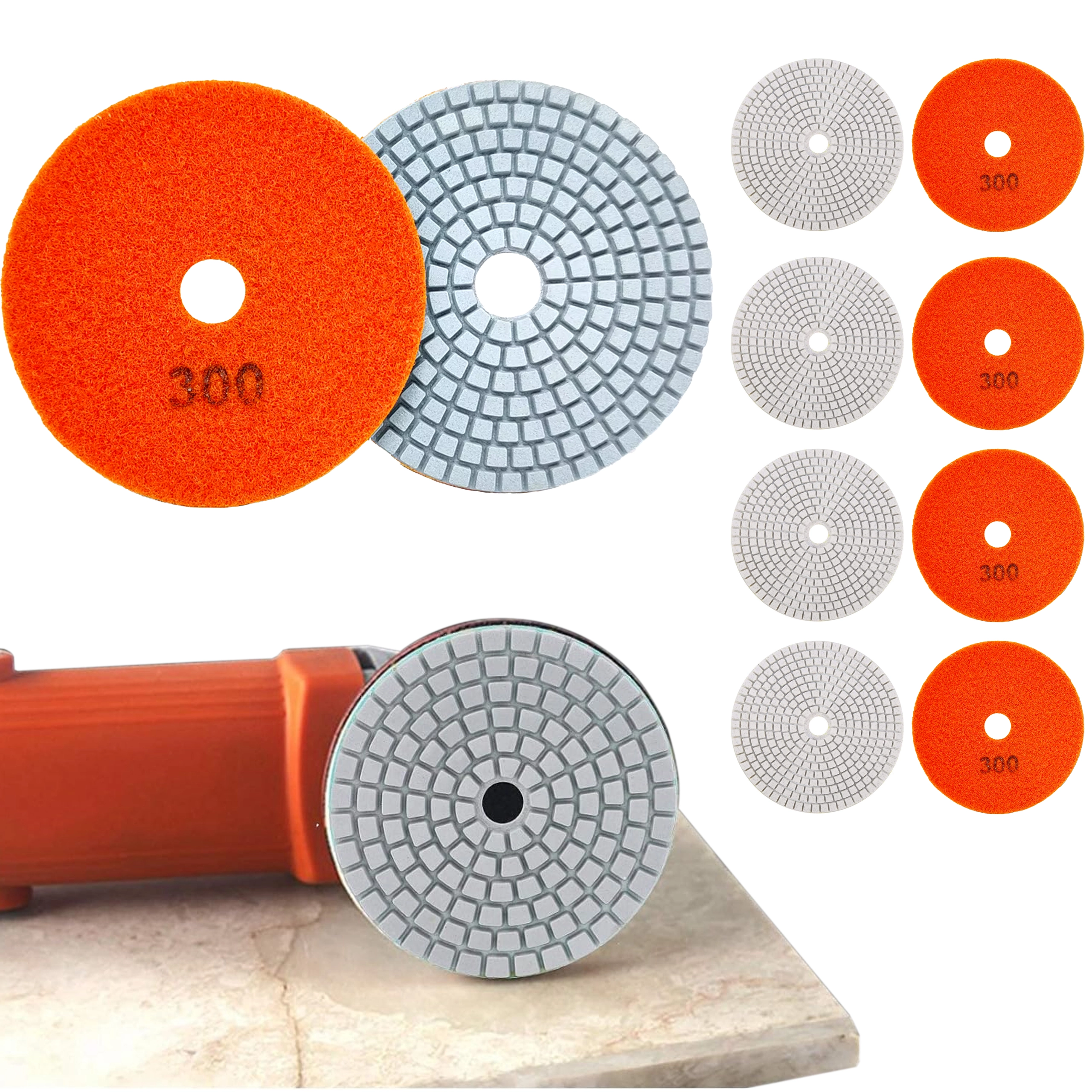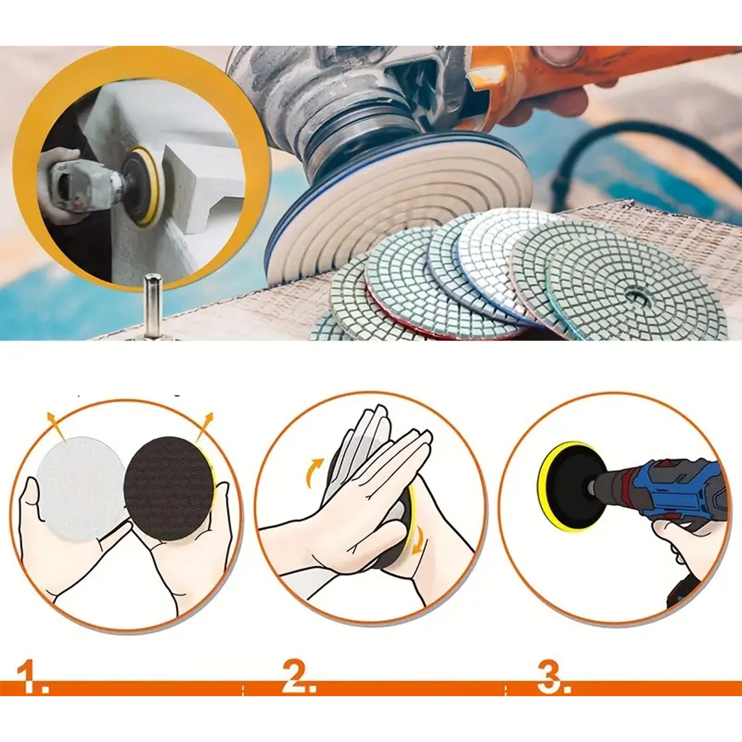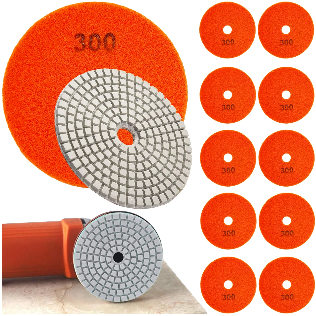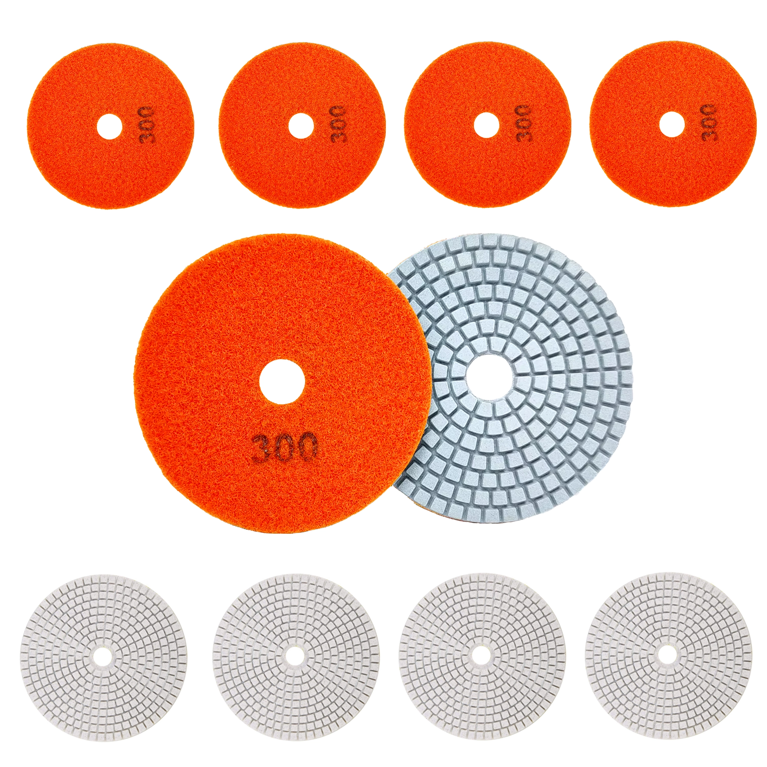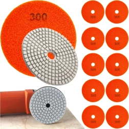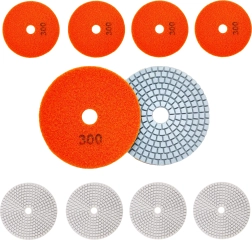 Profesionalus 10 deimantinių poliravimo diskų rinkinys, 80 mm skersmens, efektyviam gręžinio, keramikinių plytelių, akmens, marmuro ir granito šlifavimui bei poliravimui. Dėl tvirtinimo su lipnia juosta leidžia greitai keisti diskus ir tinka sausam ir šlapiam šlifavimui. 300 grūdėtumas užtikrina subalansuotą medžiagos nuėmimą ir lygų paviršių bei ilgą tarnavimo laiką.