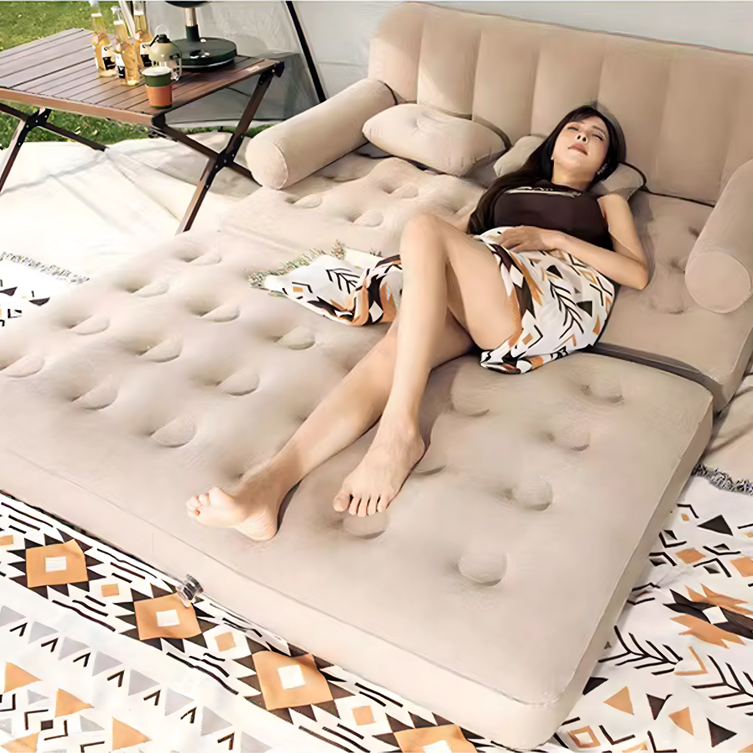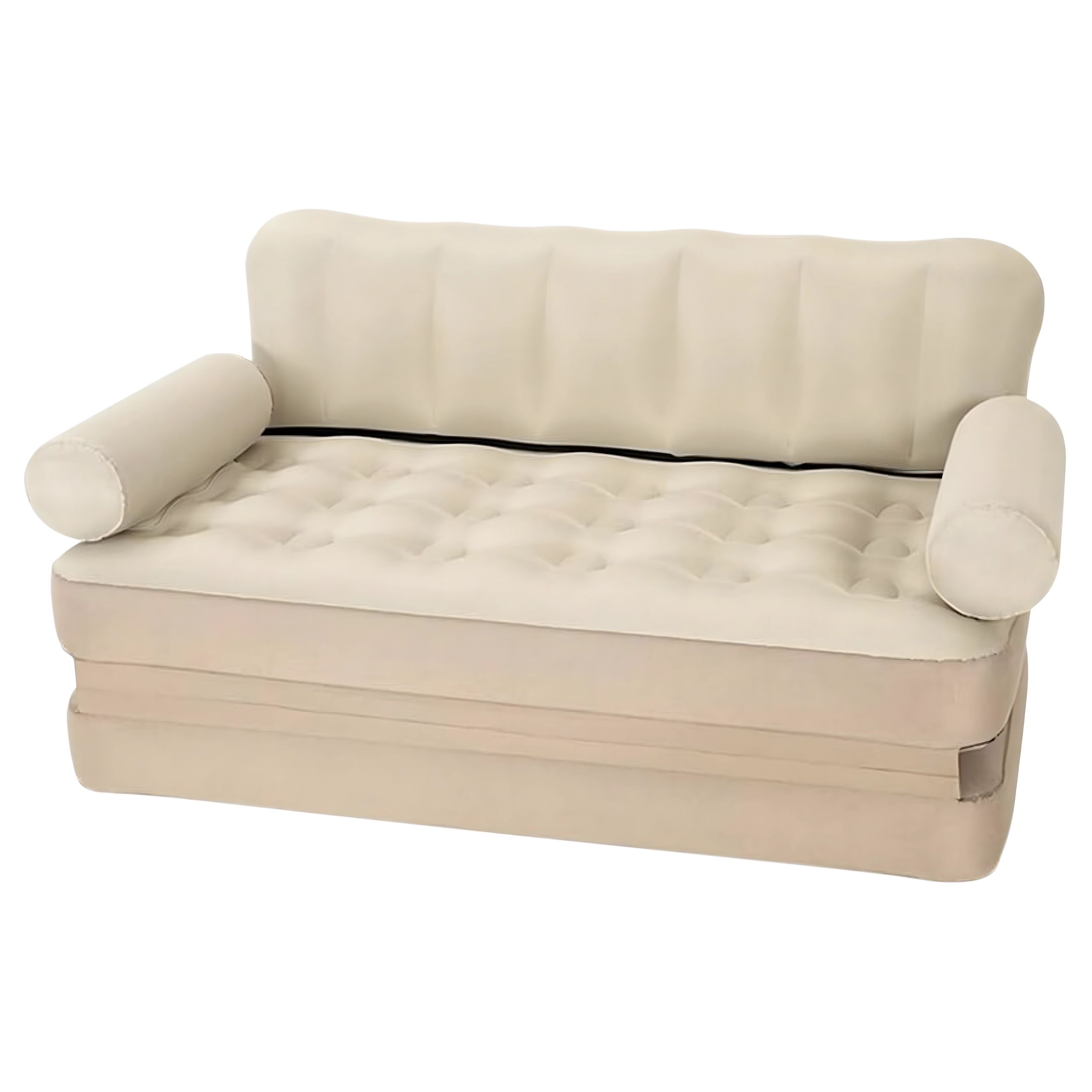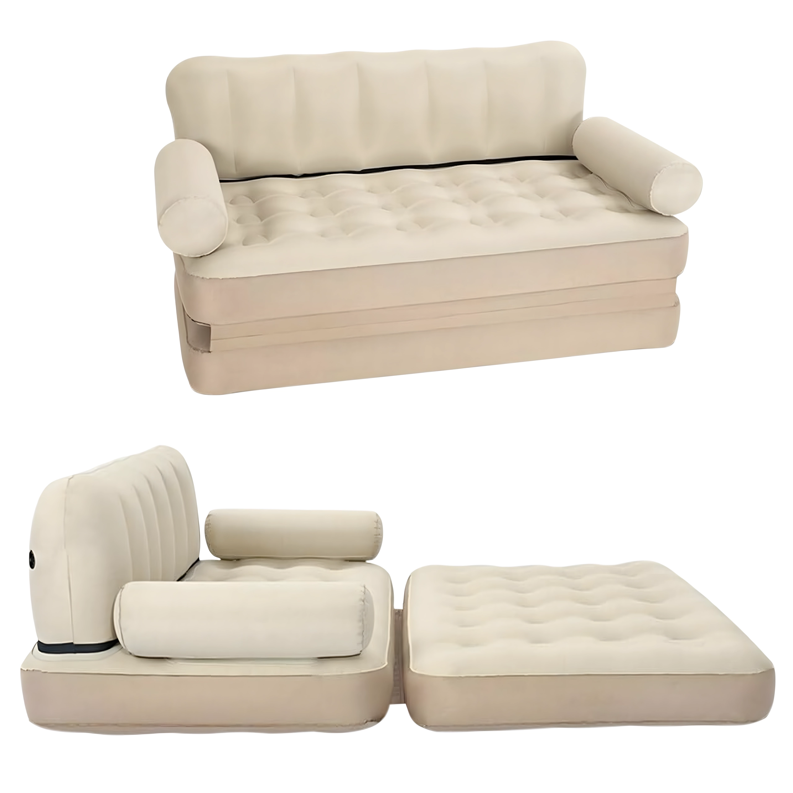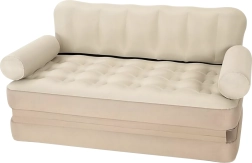 Universali pripučiama 5‑in‑1 sofa – praktiški baldai kasdieniam komfortui namuose ir kelionėse. Tarnauja kaip sofa, gultas, čiužinys ir dvigulė lova. Dėl patvaraus PVC ji yra lengva, lengvai pernešama, o elegantiška smėlio (bežinė) spalva tinka bet kuriam interjerui ir sodui.