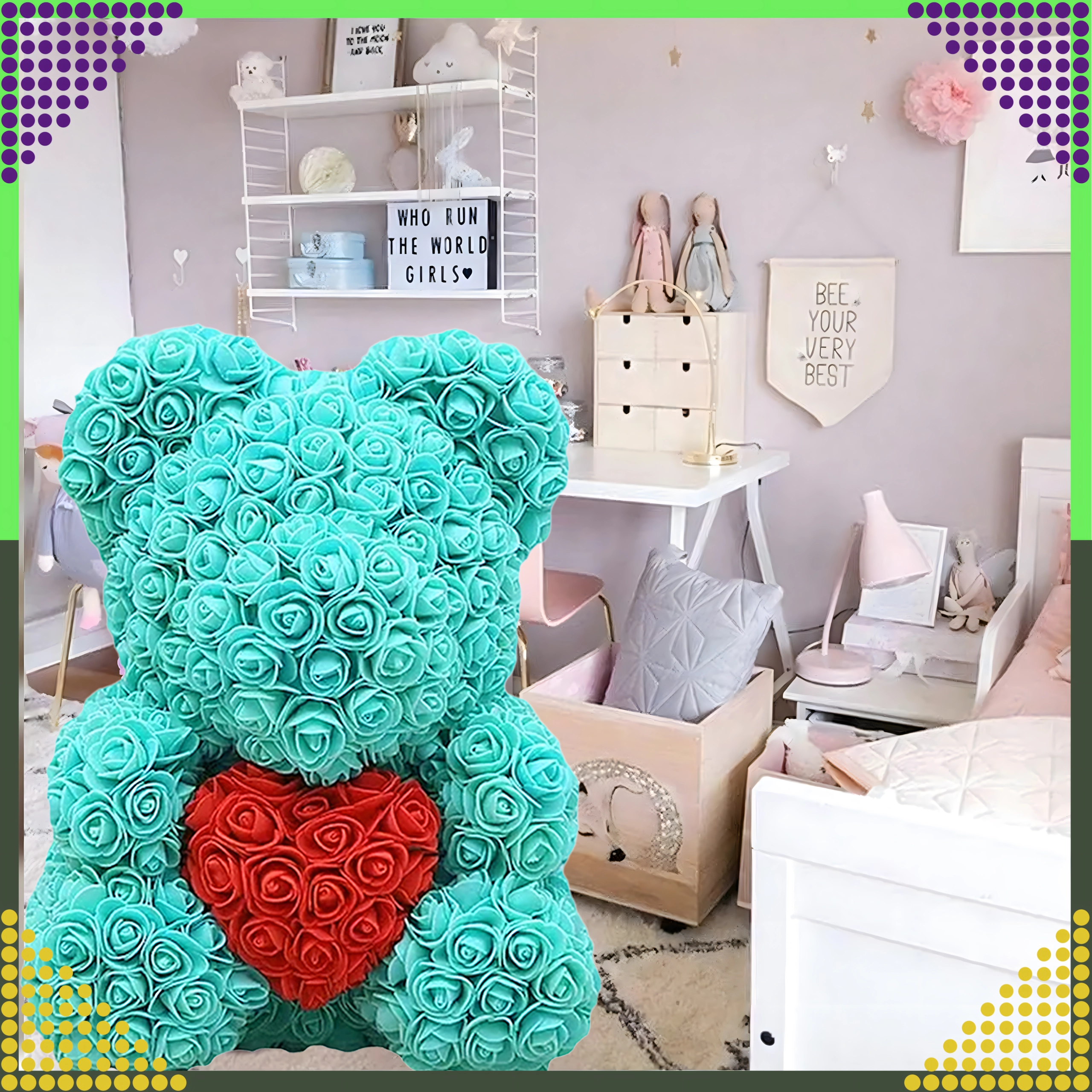 Padovanokite emocijas gražiame pateikime. Rožių meškiukas rankomis sudėliotas iš daugybės putplasčio žiedų, kurie išlaiko savo formą ir spalvą. Dėl to tai yra stilinga ir patvari dekoracija miegamajam, svetainei ar šventiniam stalui.