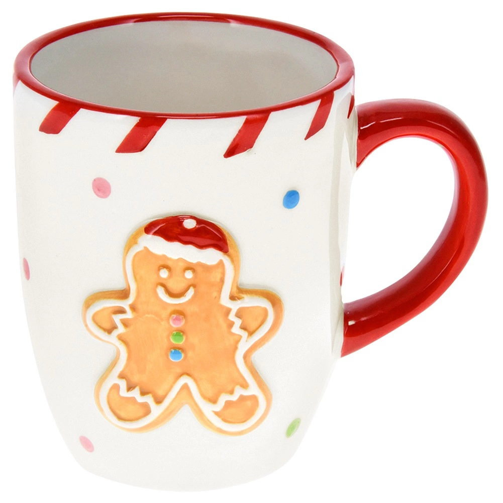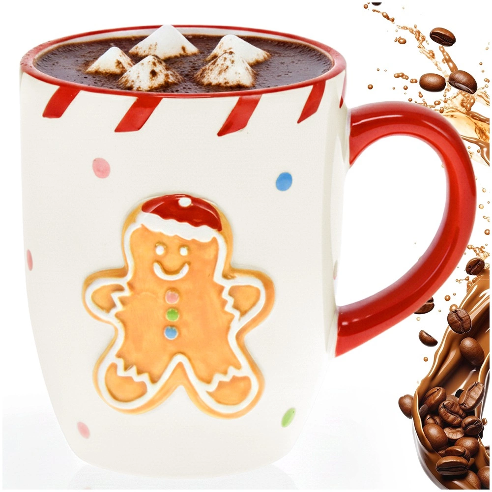 Kalėdinis keraminis puodelis su plastikiniu (reljefiniu) meduolinio žmogeliuko motyvu suteiks Jūsų virtuvei šventinę nuotaiką. Baltą paviršių papildo raudona ąselė, cukrinė dryžuota juostelė ir spalvoti taškeliai, suteikiantys žaismingą įvaizdį. 330 ml talpa idealiai tinka arbatai, kavai, kapučinui ir karštam šokoladui.