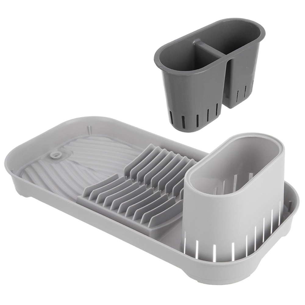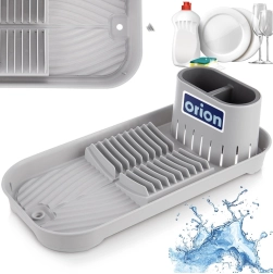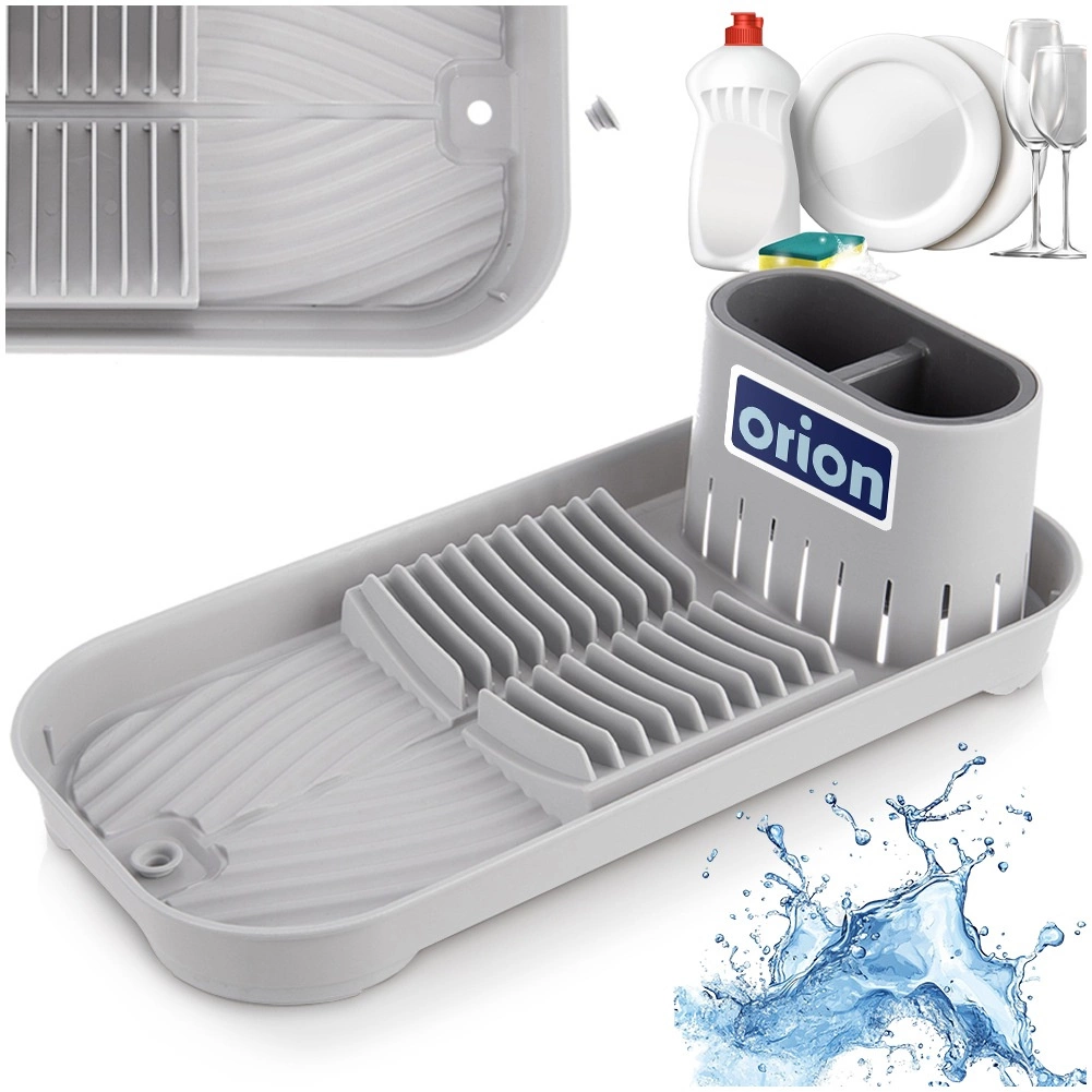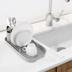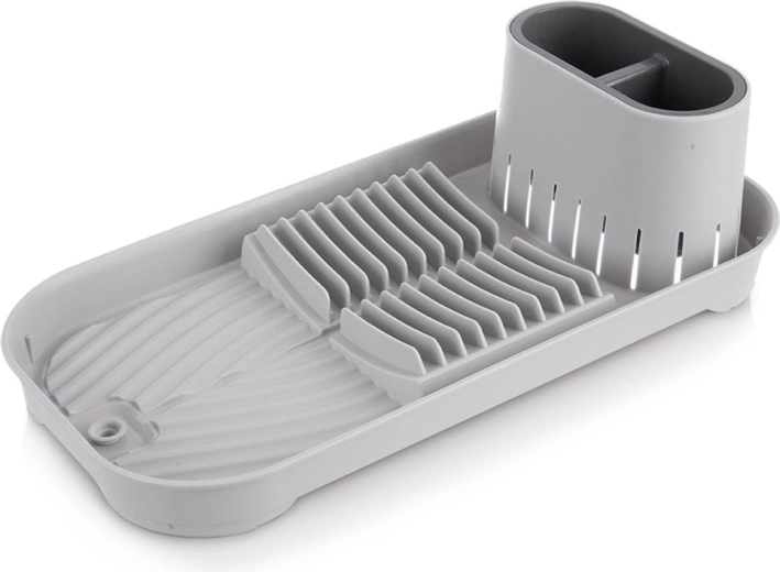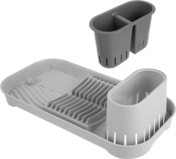 Kompaktiškas pilkas indų džiovintuvas su išimamu stalo įrankių dėklu, vieta iki 9 lėkščių ir puodeliams bei dubenėliams. Dėl integruoto nutekėjimo su užraktu vanduo tiesiai nubėga iš griovelių, saugo stalviršį ir palaiko sausą zoną aplink kriauklę. Stabili, neslystanti bazė ir paprasta priežiūra – savaime suprantama. Matmenys 39 × 19,5 × 11 cm.