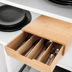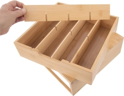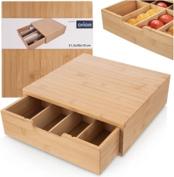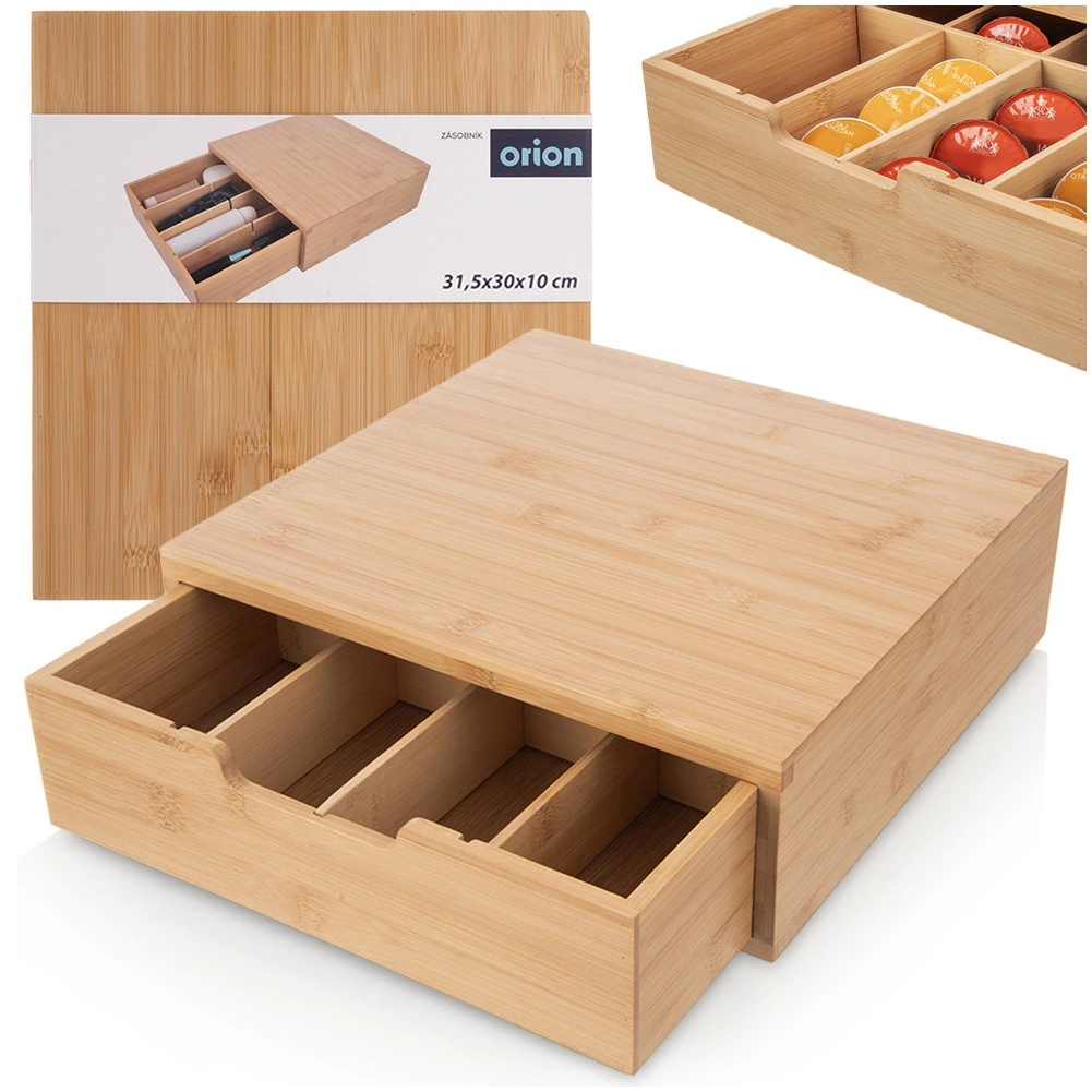 Elegantiškas organizatorius iš natūralaus bambuko jungia stilingą išvaizdą ir funkcionalų išdėstymą. Stalčius su pertvarais leidžia patogiai rūšiuoti kapsules, arbatos pakelius, prieskonius ir kitas smulkmenas. Prisitaikykite vidinį išplanavimą naudodami išimamas dalis tiksliai pagal savo poreikius.