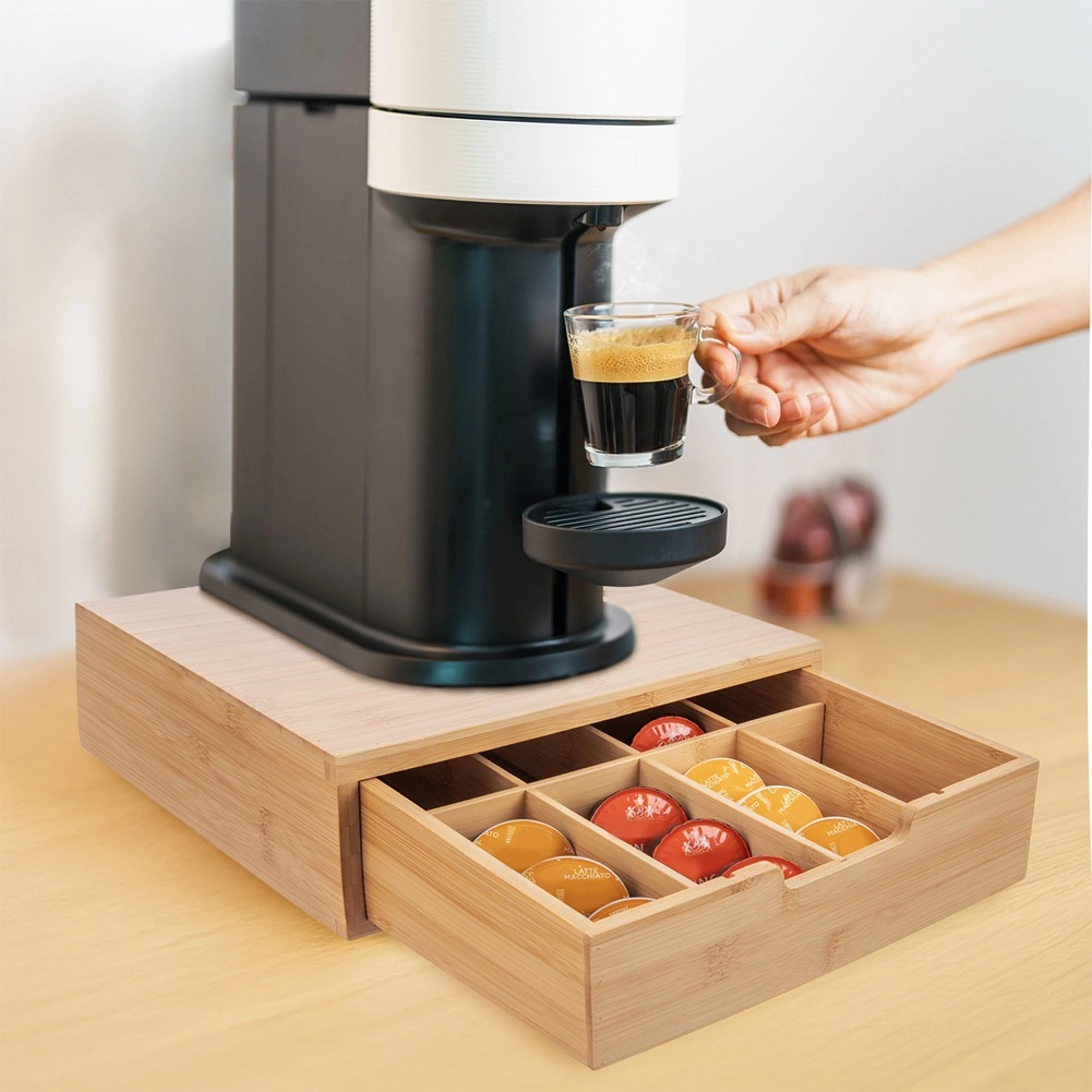 Organizatorius išlaiko kavos aparatą ir kartu paslepia kapsules stalčiuje – viskas tvarkingai ir po ranka.
