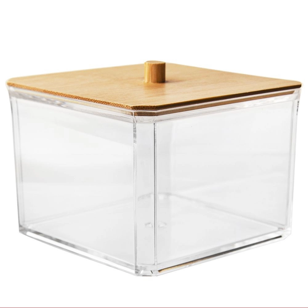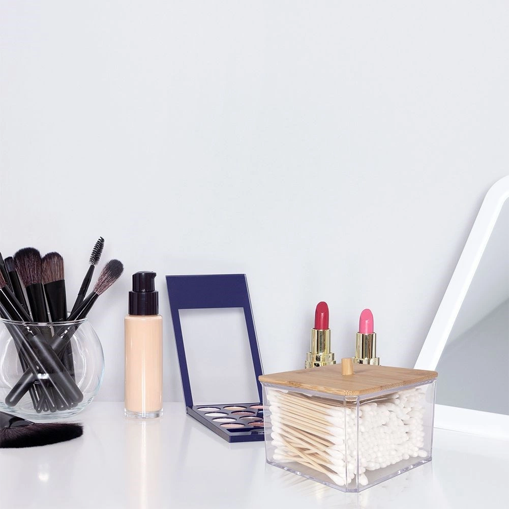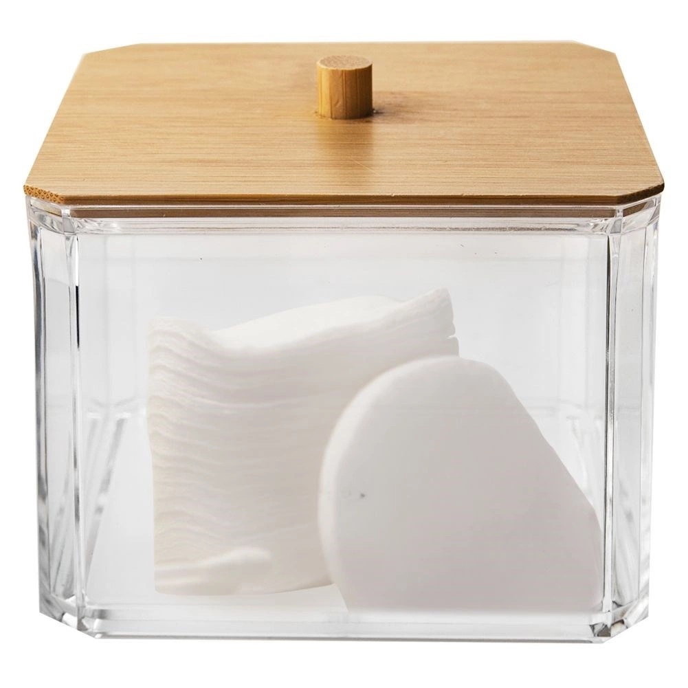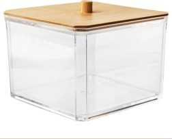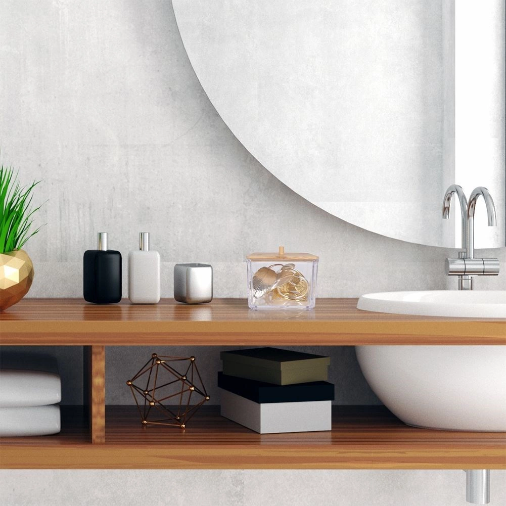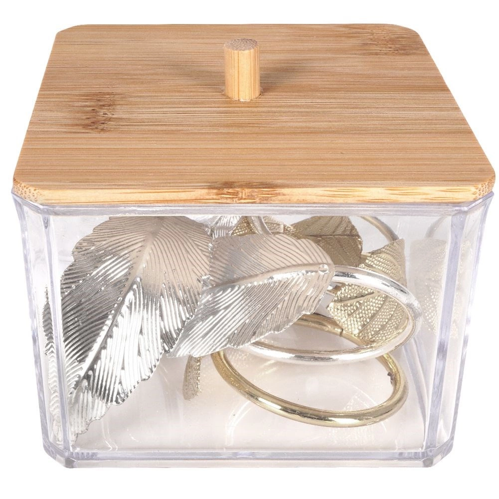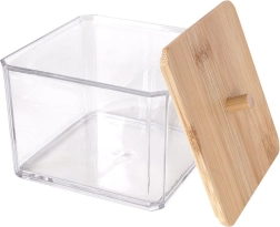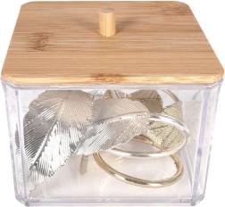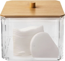Ši elegantiška vatos lazdelių dėžutė derina skaidrias, patvaraus plastiko sieneles ir natūralų bambukinio dangtelio vaizdą su patogia rankenėle. Puikiai tinka vonios kambariui, miegamajam ar kosmetikos kampeliui – smulkmenas išlaikys tvarkingai sudėtas ir be dulkių.