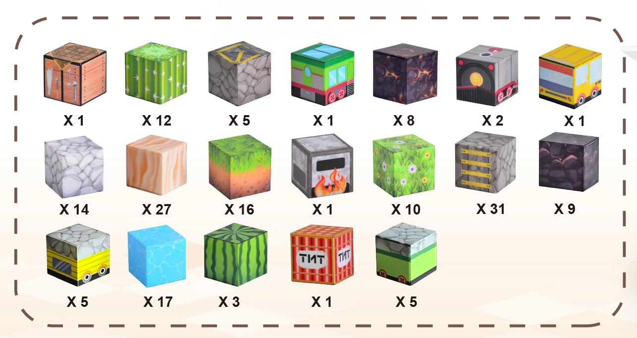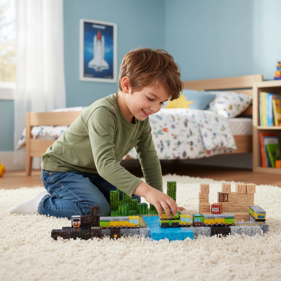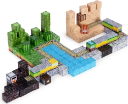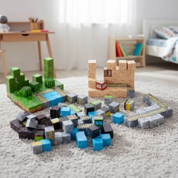 Spalvoti blokeliai su žolės, vandens, medžio ir akmens atvaizdais leidžia statyti peizažus, tiltus ir bėgius nesibaigiančiam žaidimui.