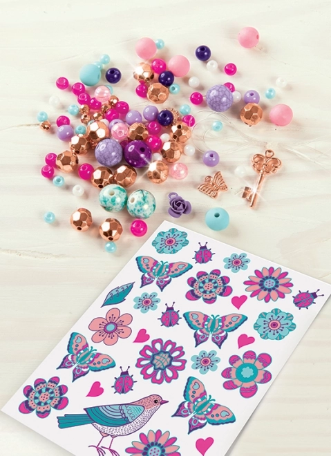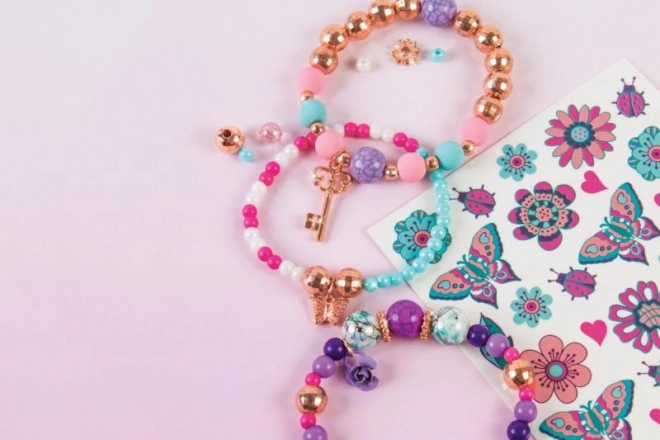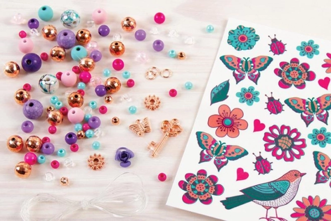 Lavink kūrybiškumą ir susikurk savo gėlėtas apyrankes, kurias suderinsi su laikinosiomis tatuiruotėmis. Dėl spalvingų karoliukų, pakabukų ir paprasto vėrimo per akimirką sukursi papuošalus, kurie pradžiugins kiekvieną mažą puošeivą.